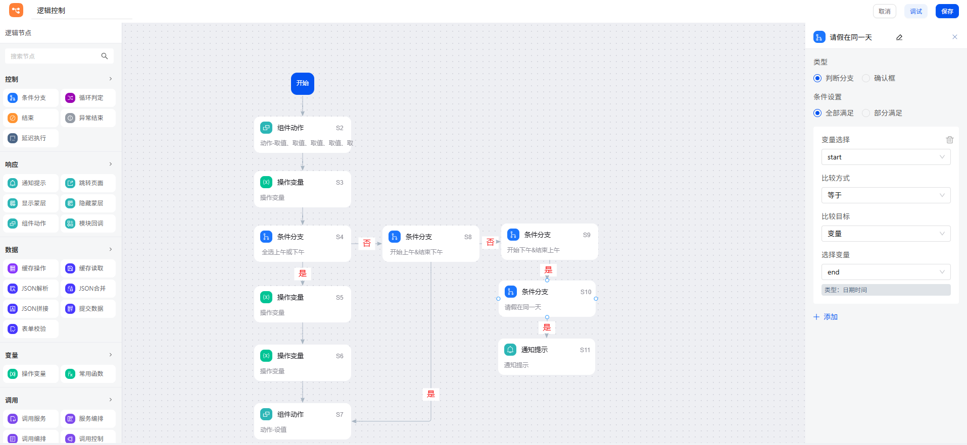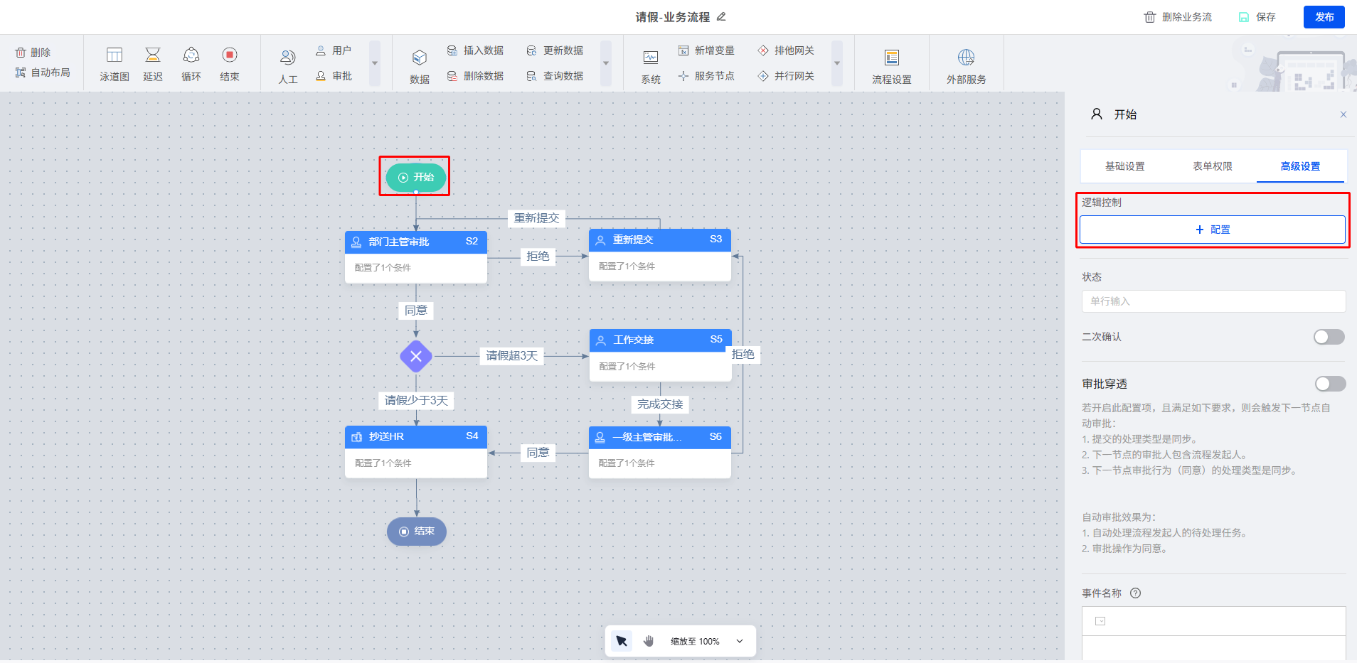 请假申请由于要提交流程审批,需进入业务流配置页,在开始节点新增逻辑控制。