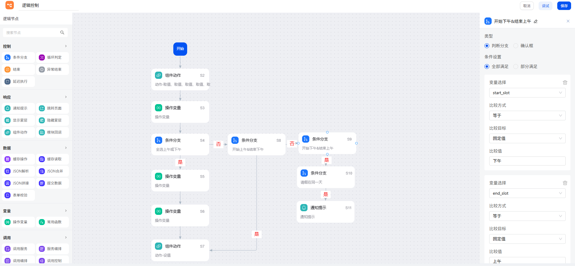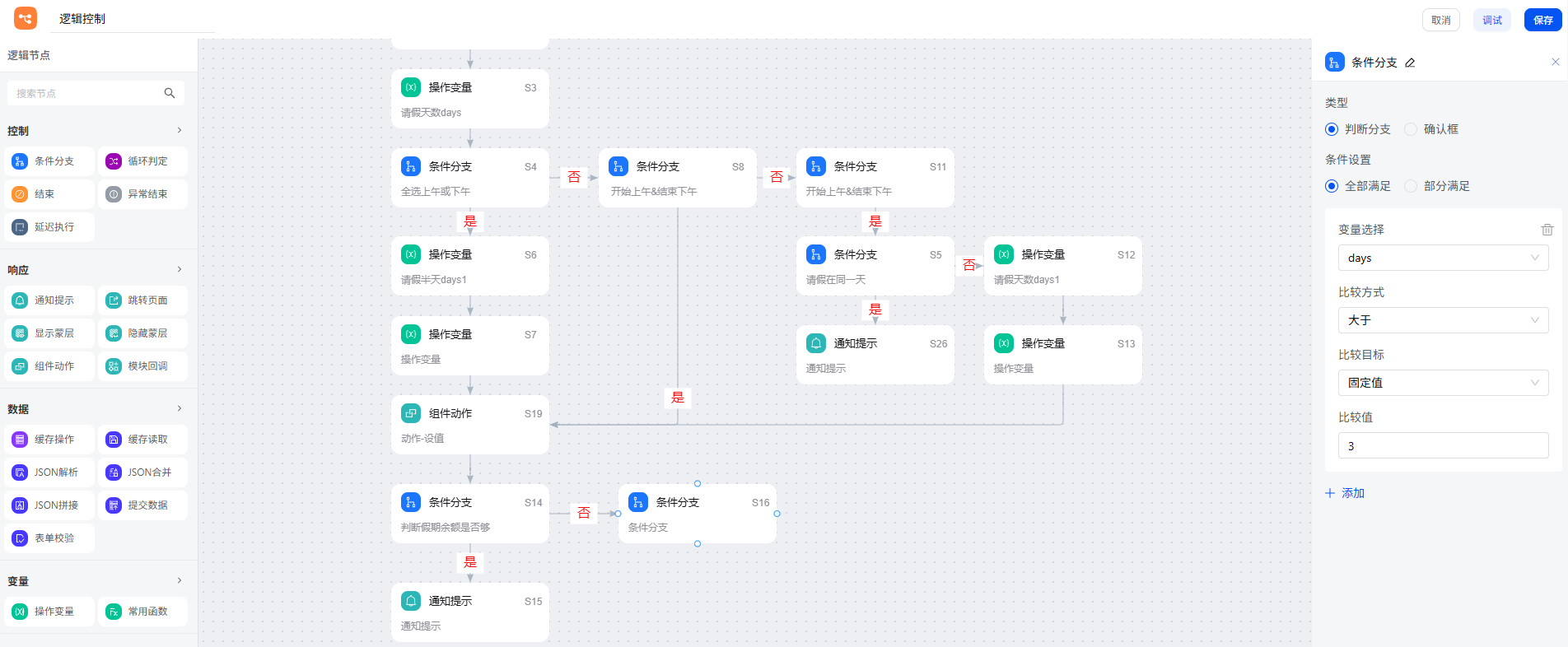 由于请假时段有多种选择情况(上午或下午),还需进一步判断,计算出正确的天数。拖入条件分支,判断时段相同的情况,即请假半天。