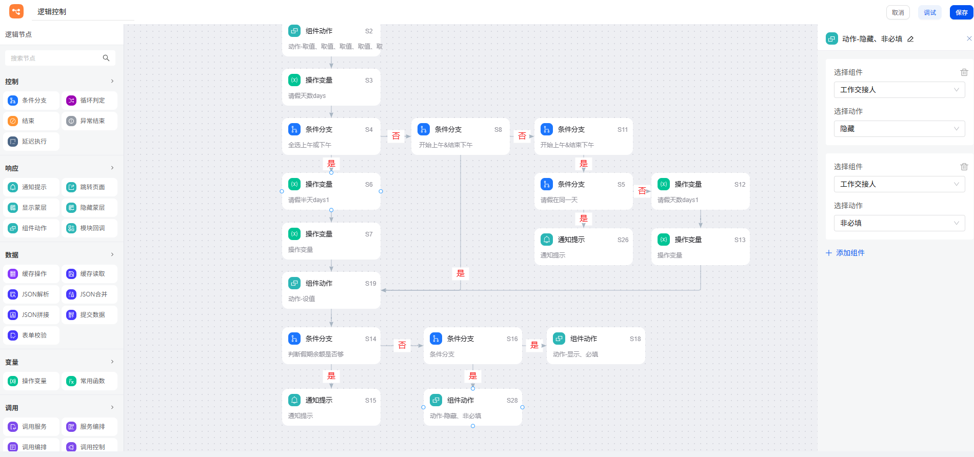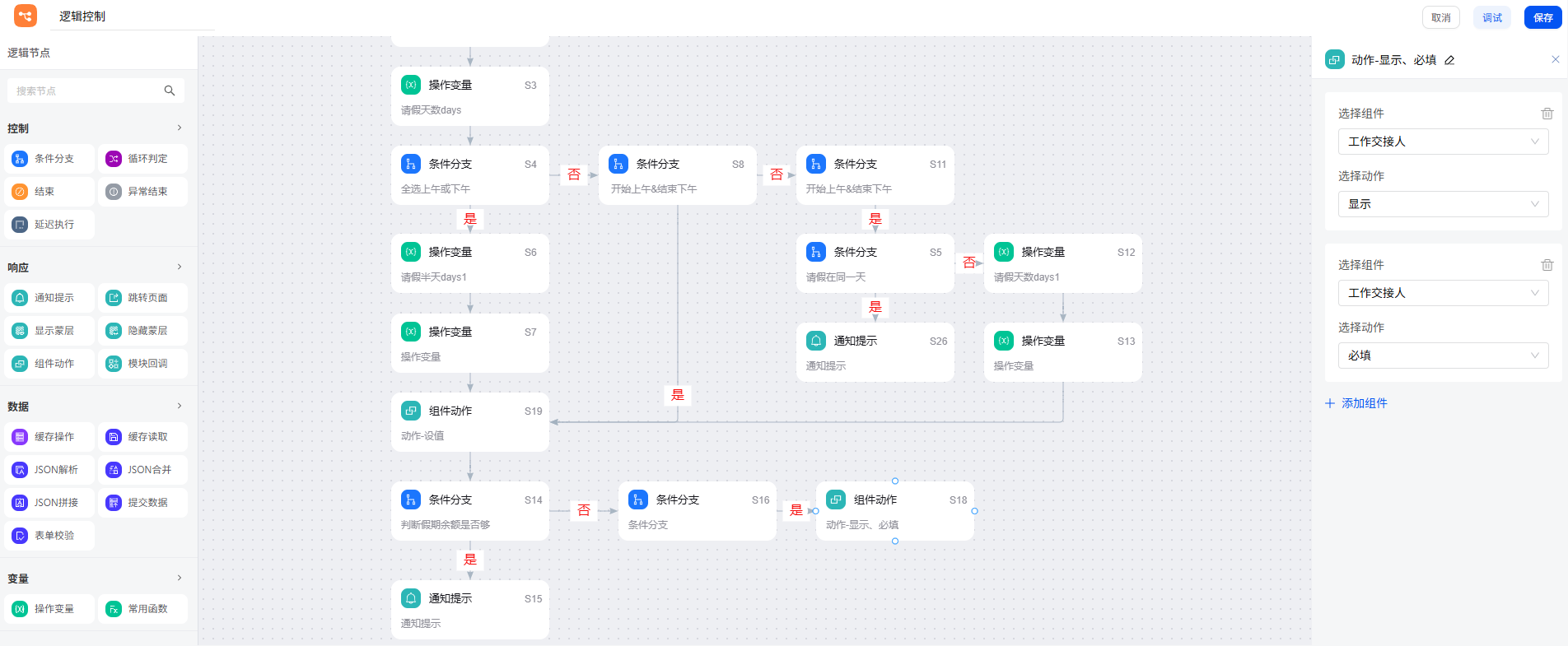接着,判断是否需要工作交接:条件分支判断请假天数是否大于 3 天,如果符合,通过组件动作,显示并必填”工作交接人“ 表单字段。