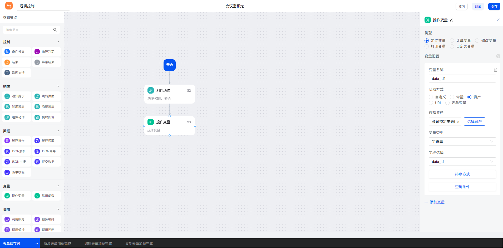 点击添加变量,将查询结果命名为“data_id1”变量,选择查询“会议室预定表”,查询字段为该表的主键 data_id。