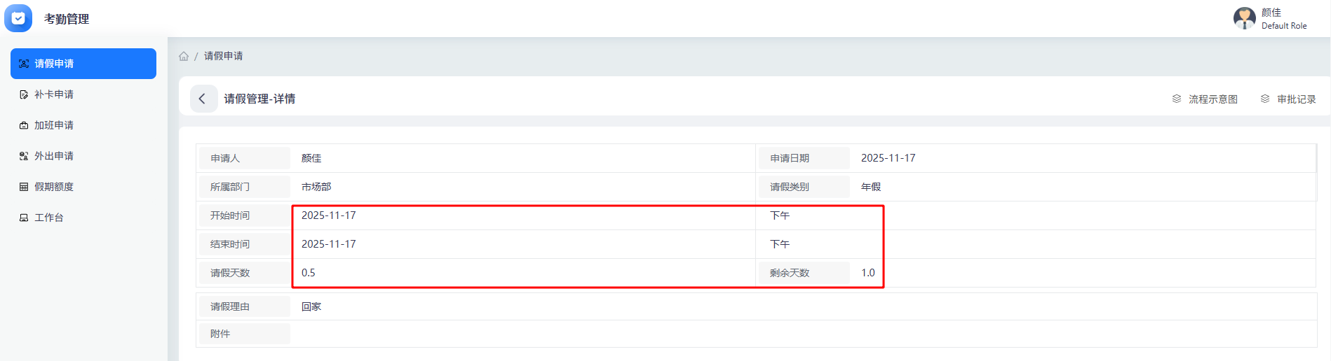 第一种,上午→下午,这属于完整请假区间,之前计算的天数(days)是准确值,无需调整,直接连接组件动作回填请假天数。
