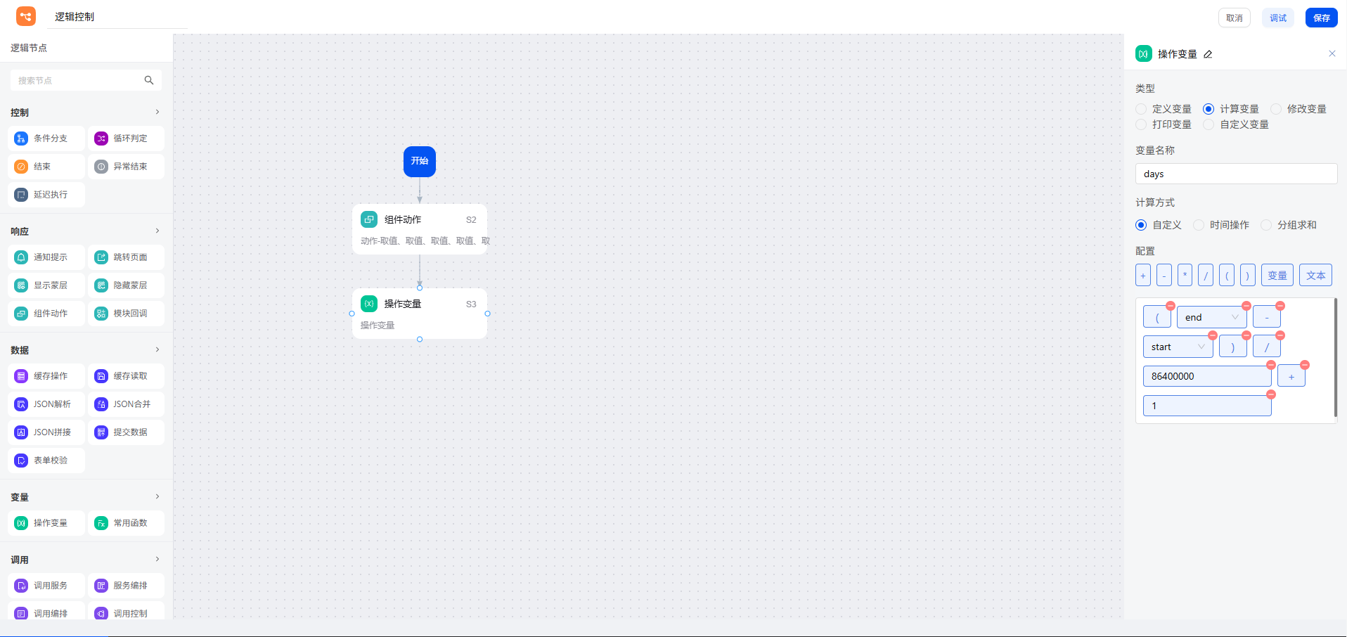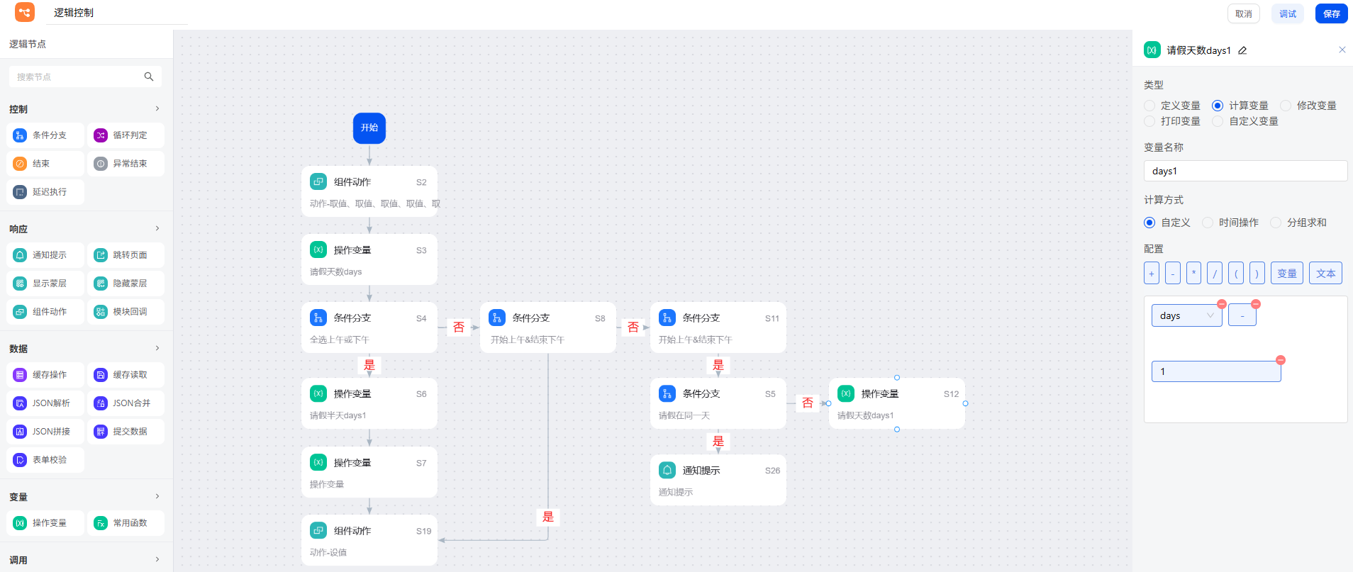 2. 若为跨天:则头尾各请半天,需要将初始天数(days)减去 1 天。同样,再次利用操作变量节点,将初始请假天数变量 days 更新为此值,最后回填结果。