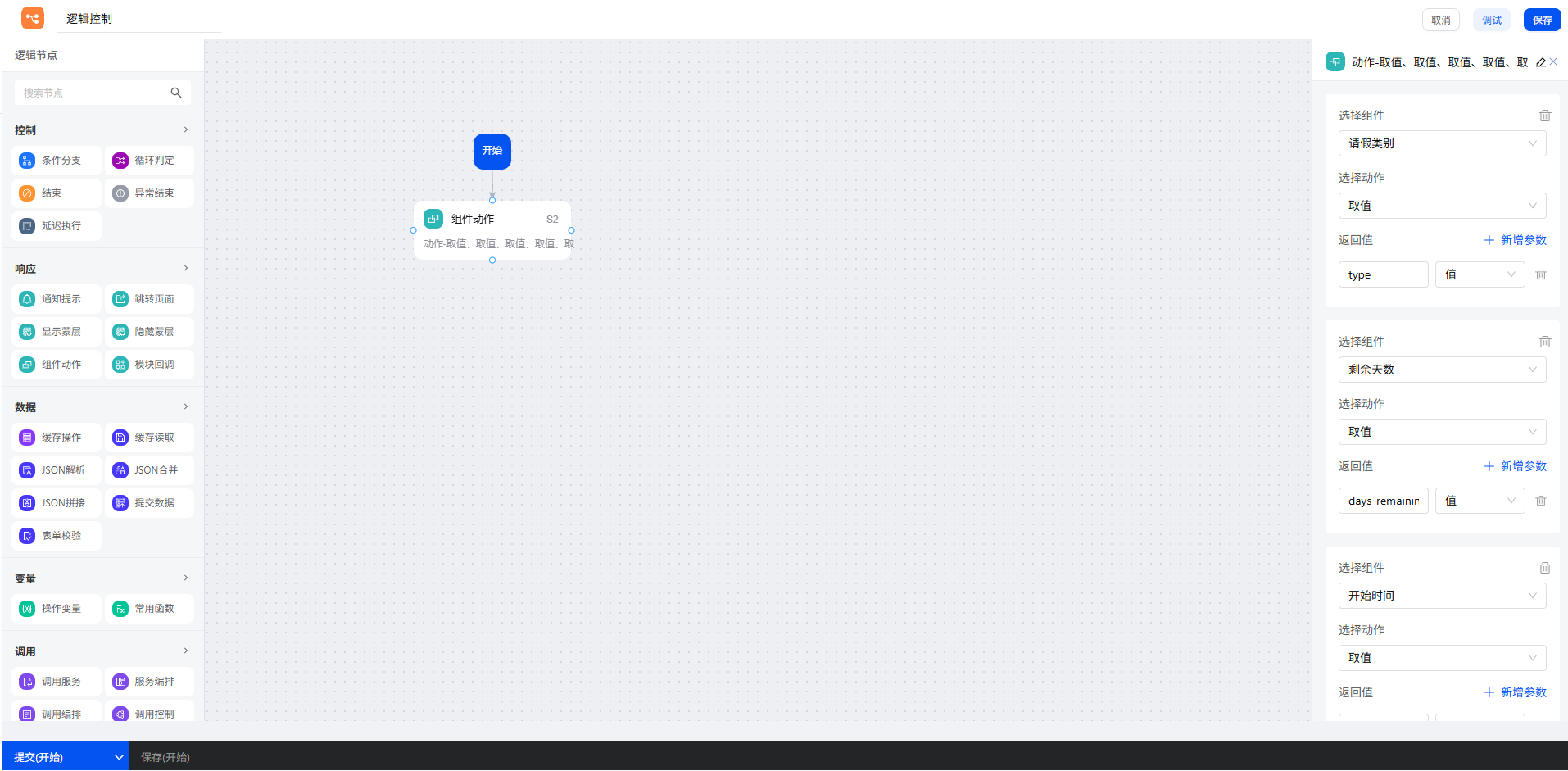 这个场景的核心在于精确计算请假天数,通过条件分支来处理多种时段组合。首先,使用”组件动作“节点,获取申请人填写的请假开始/结束时间、请假类型,以及根据请假类别数据映射带出的剩余假期天数。