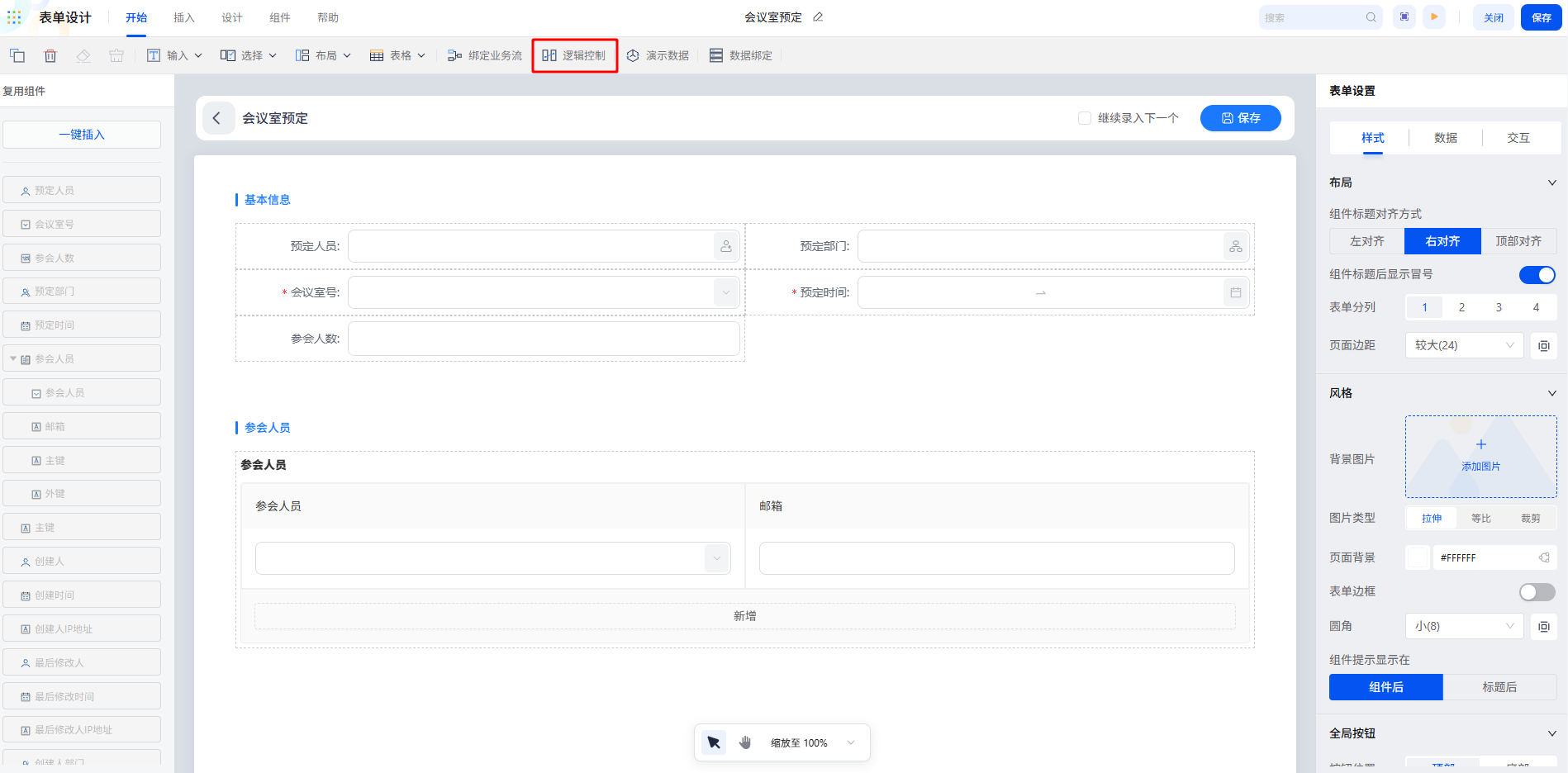 进入会议室预定表单的“逻辑控制”配置页,新增“表单保存时”的触发逻辑,这意味着,当用户点击‘保存’按钮时,预设的校验规则便会自动执行。