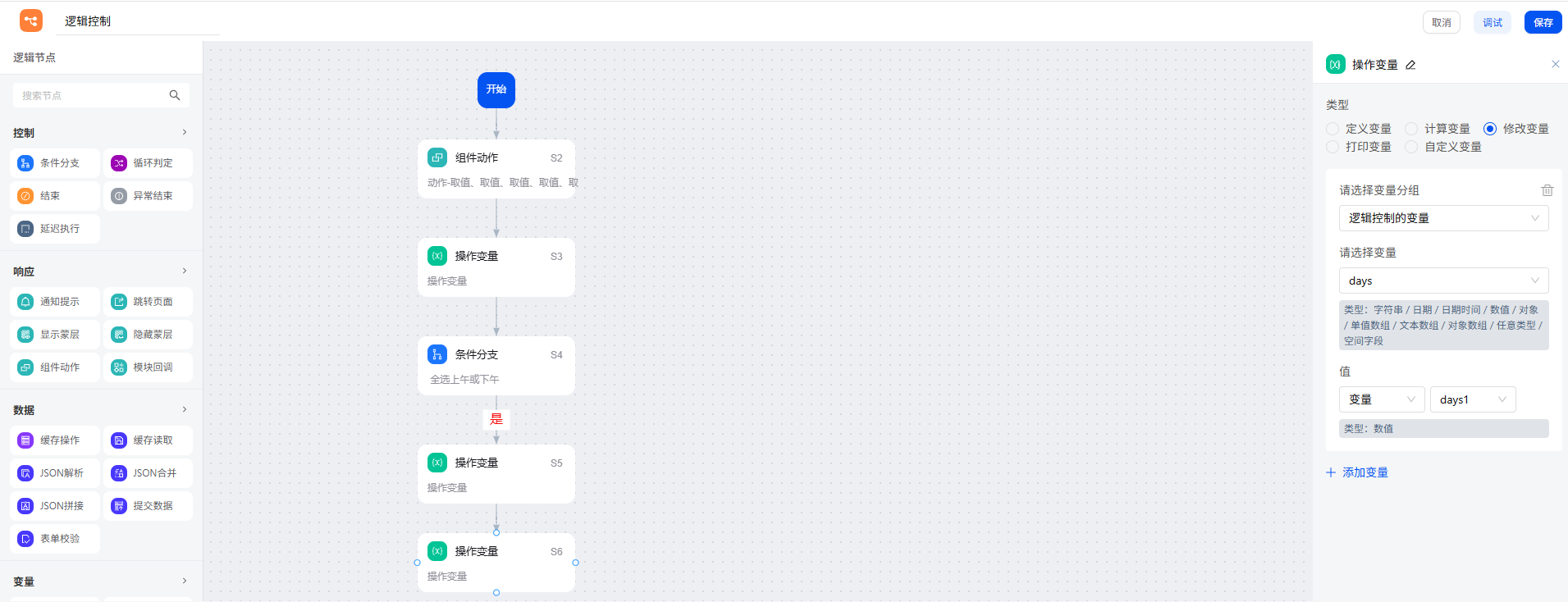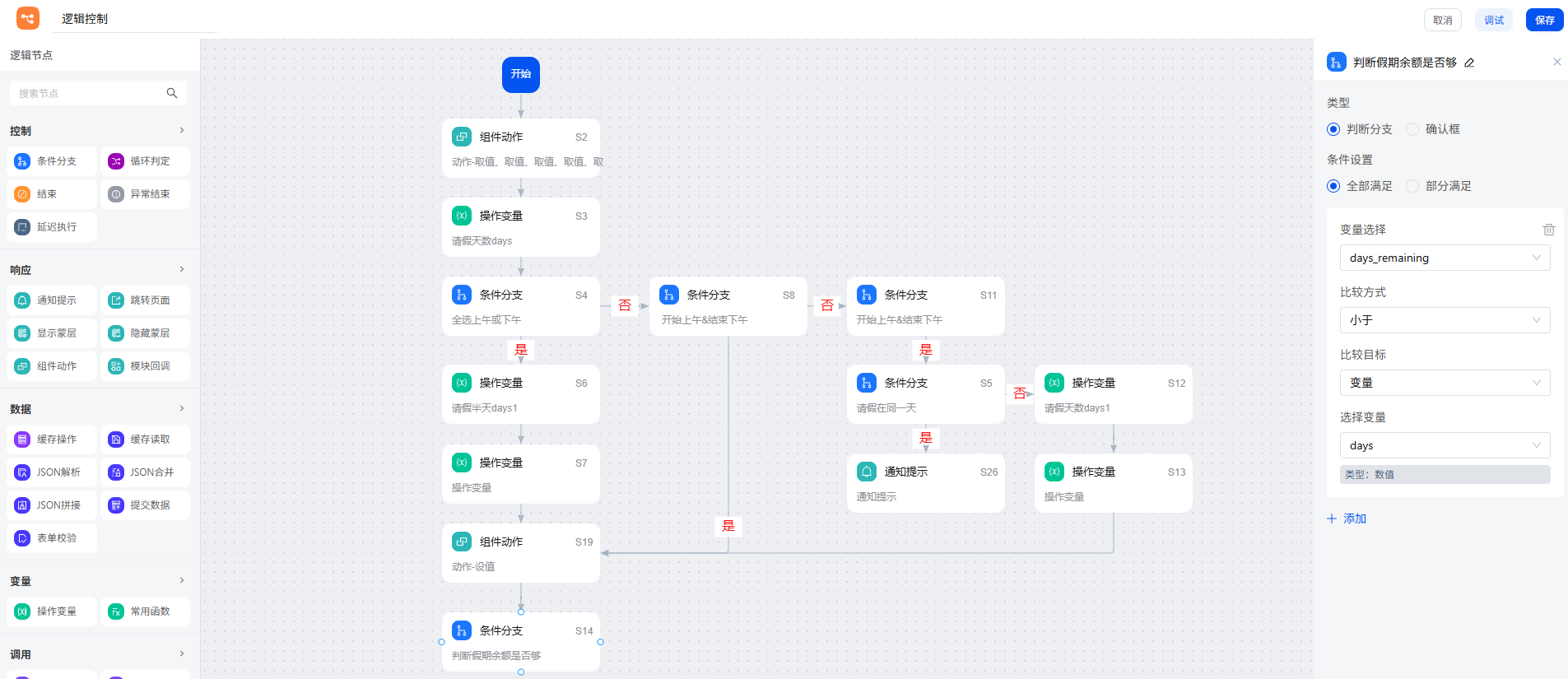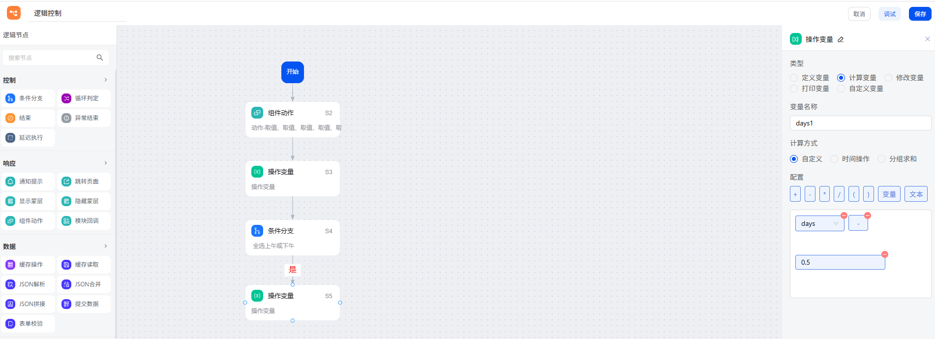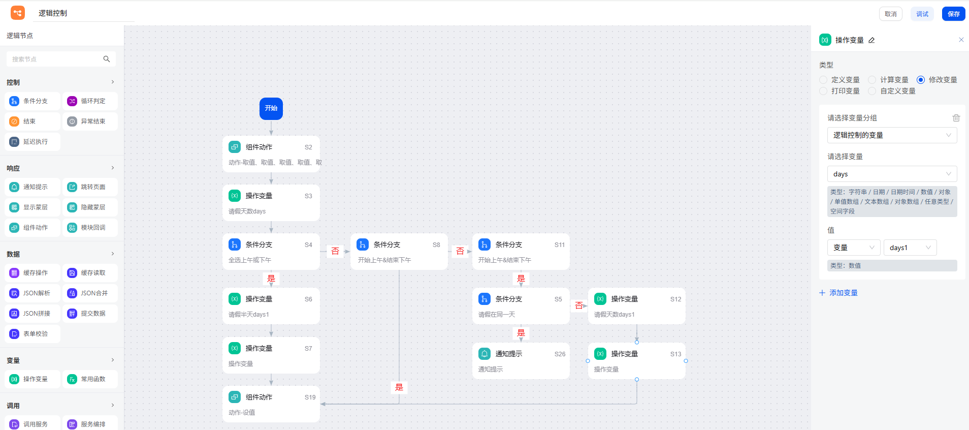 如果条件符合,原请假天数减 0.5 天。再通过操作变量节点的修改变量功能,将初始请假天数变量 days 更新为此值。
