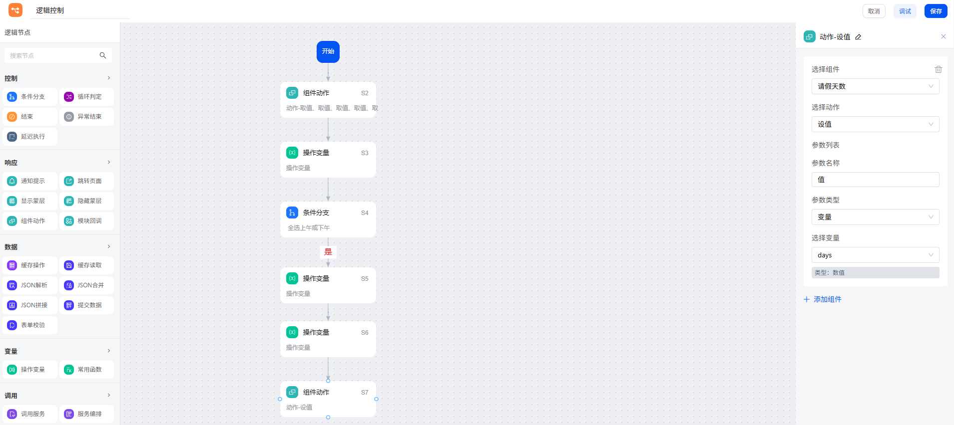 最后使用“组件动作—设值”将结果回填至表单的“请假天数”组件。