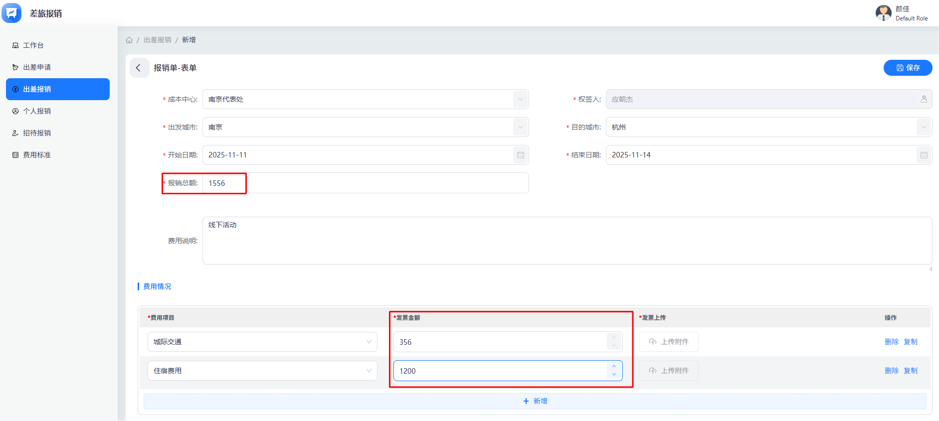 • 差旅报销:自动汇总多笔明细费用,快速完成报销核算。