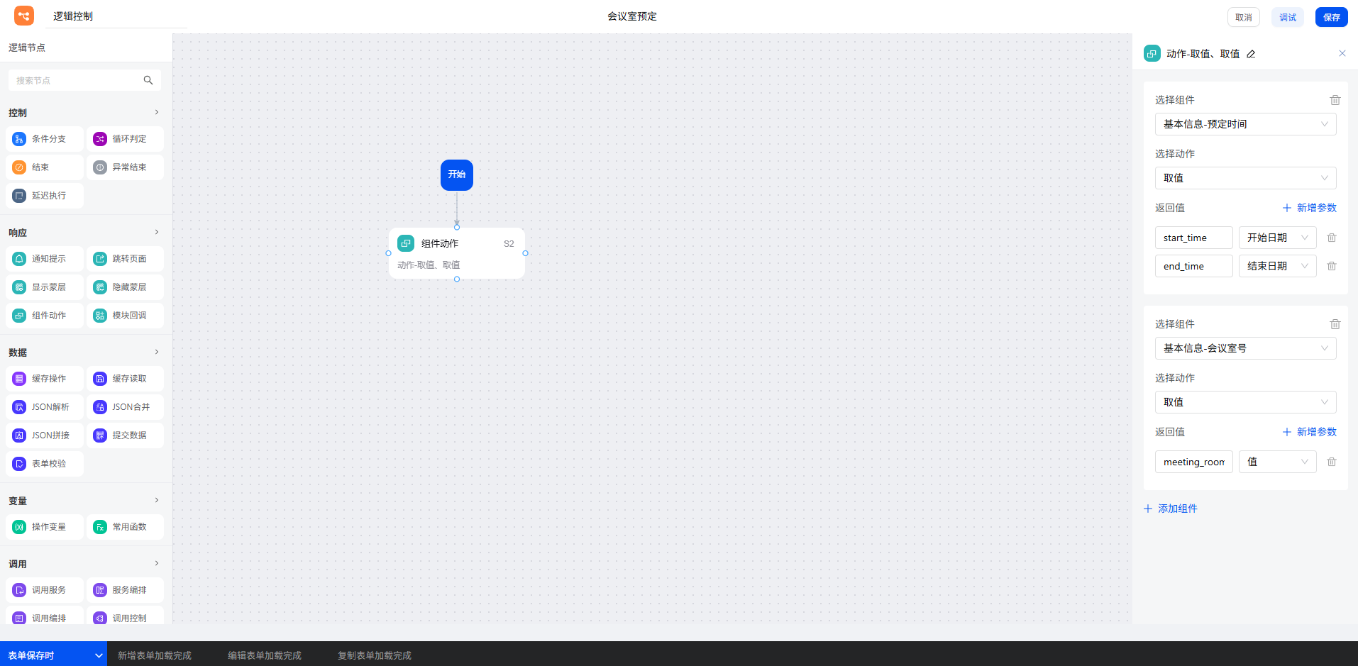 新增”组件动作“节点,获取用户填写的会议开始时间、结束时间和选择的会议室号,将它们暂存为变量,方便后续使用。