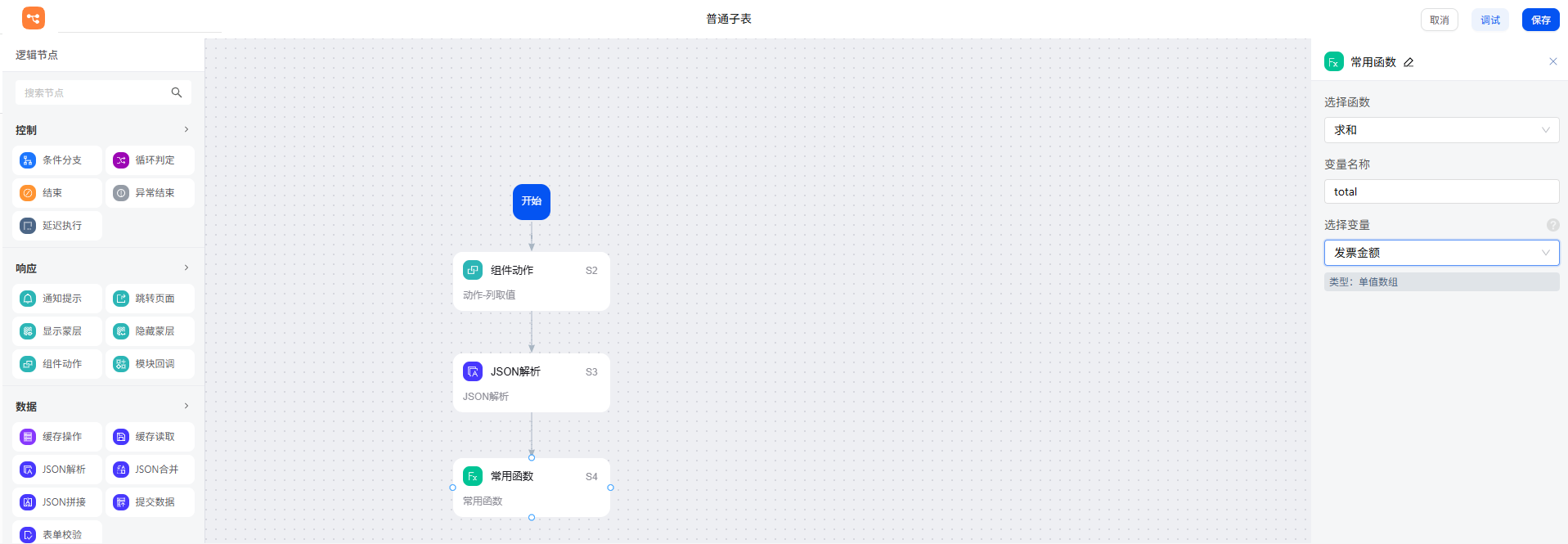 首先还是使用组件动作节点,获取子表发票金额列的所有数据,命名为 amount 变量。此时获取的数据类型为对象数组。