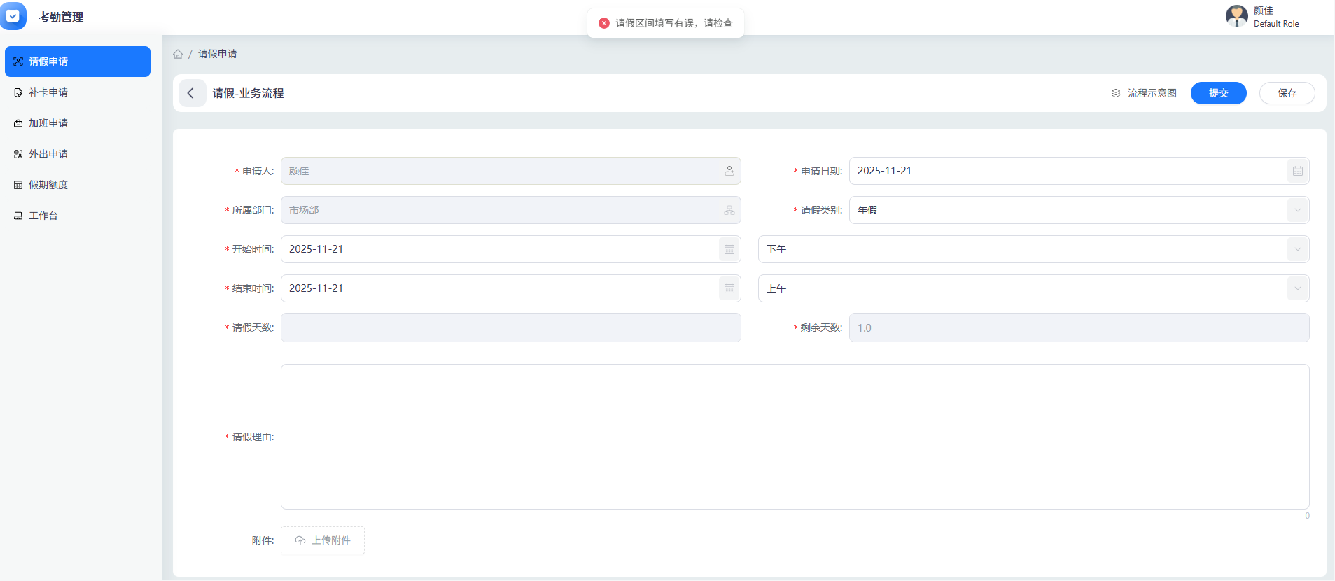 1. 若为同一天:弹出提示“请假区间填写有误”