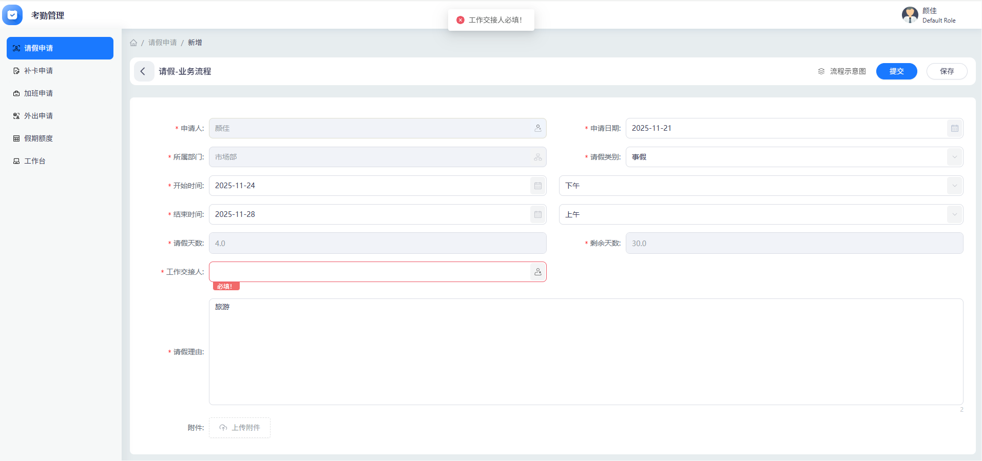 再试跨天不完整请假,请假天数超出 3 天,工作交接人字段自动显示并校验必填。