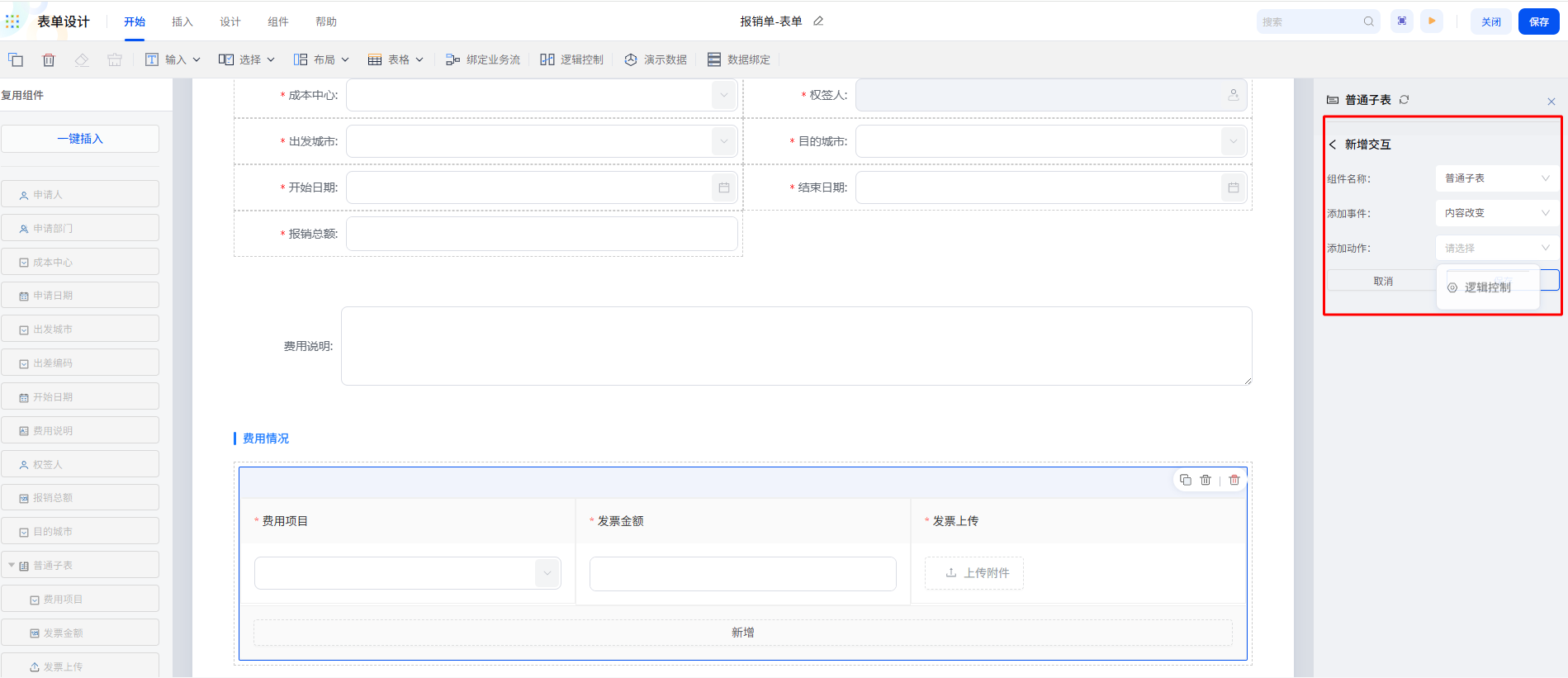 最后再来看费用报销场景中的子表自动计算功能。在这个场景中需要实现子表金额的实时汇总。只需配置"子表内容改变时"的触发逻辑,系统就能在用户增删或修改子表记录时自动更新总金额。