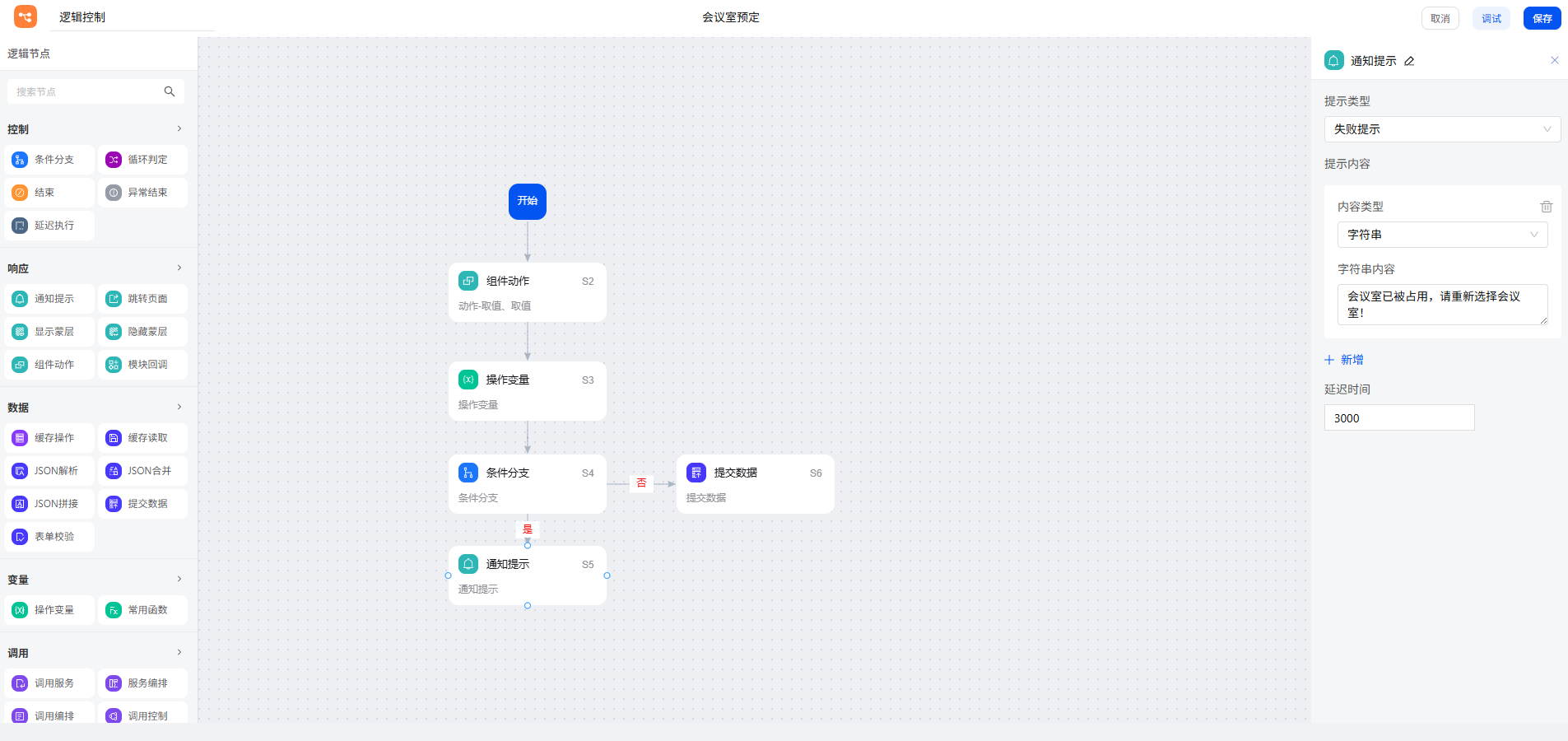 再利用”通知提示“节点,在条件符合时,给予失败提示:会议室已被占用,请重新选择会议室!不符合条件,则走向“否”的分支,连接“提交数据”节点,完成预定。
