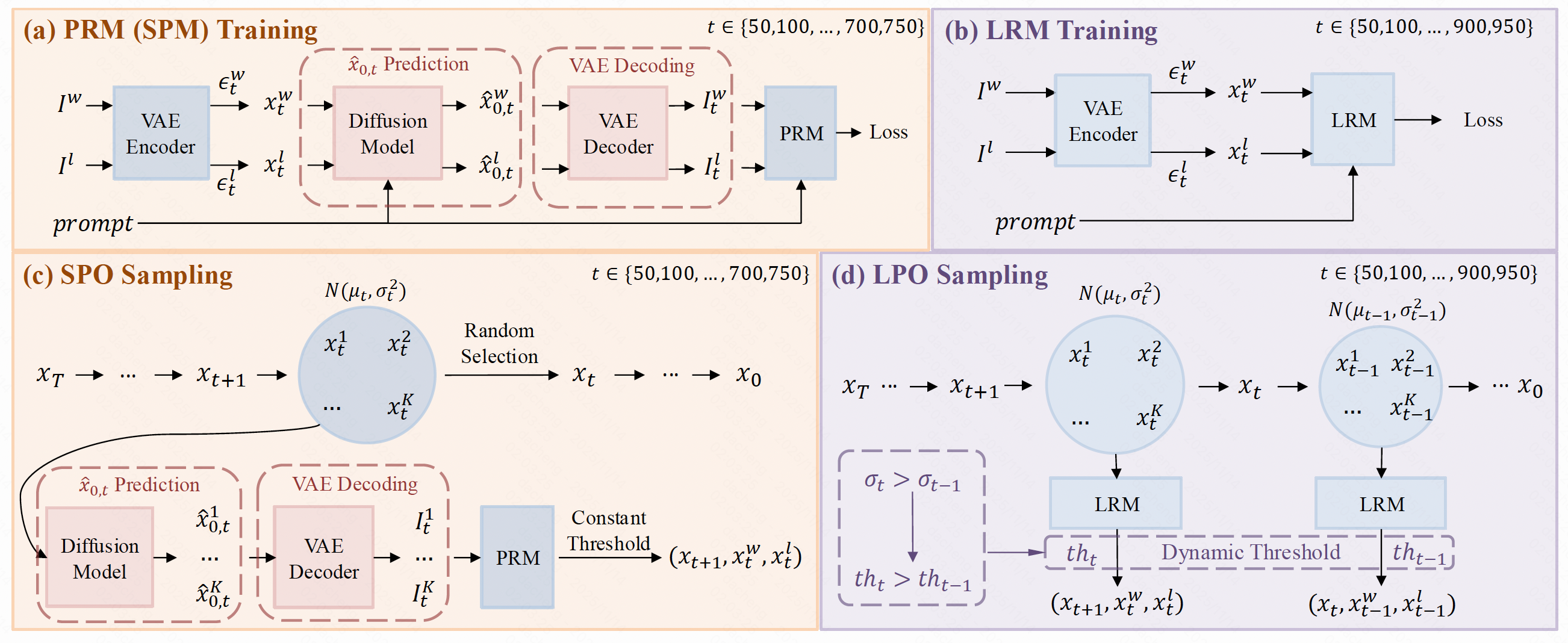基于 LRM,本论文提出隐空间的逐步偏好优化方法 LPO(Latent Preference Optimization),其在扩散模型的隐空间进行在线采样,并利用 LRM 对样本进行打分和筛选,然后在隐空间对模型进行偏好优化。LPO 可以在整个去噪过程(t ∈ [0, 950])中进行优化,而传统方法如 SPO 仅能覆盖低中噪声段(t ∈ [0, 750]),这进一步体现了 LRM 在高噪声条件下的鲁棒性与适应性。