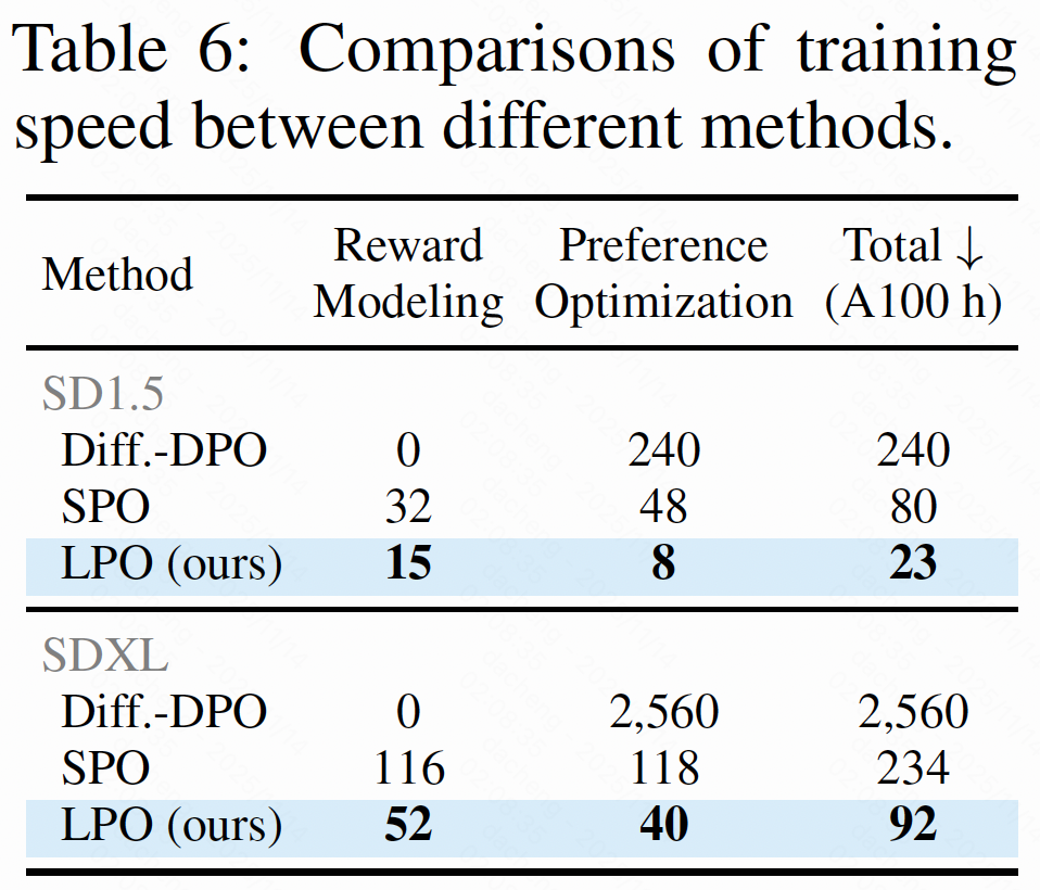 除了性能提升,LPO 在训练效率方面也实现了质的飞跃。以 SDXL 为例,LPO 的总训练时间仅为 92 小时,而传统的 Diffusion-DPO 方法需 2560 小时,SPO 也需 234 小时。LPO 的训练速度分别是两者的 28 倍和 2.5 倍,极大地降低了模型对齐的计算门槛。