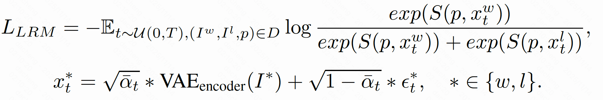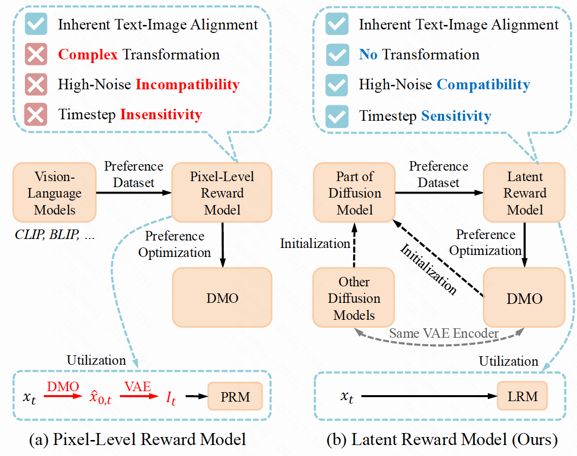 本文提出的核心洞见是:扩散模型本身就具备建模偏好的潜力。它们在预训练过程中已经学习到了丰富的文本-图像对齐能力,能够直接处理带噪隐变量,不需要进行 VAE 的解码。并且扩散模型对不同时间步的噪声强度具有天然敏感性。因此,作者提出将扩散模型“改造”为一个噪声感知的隐式奖励模型(LRM),在隐空间中预测图像对的偏好关系,从而规避传统像素级方法的种种限制。