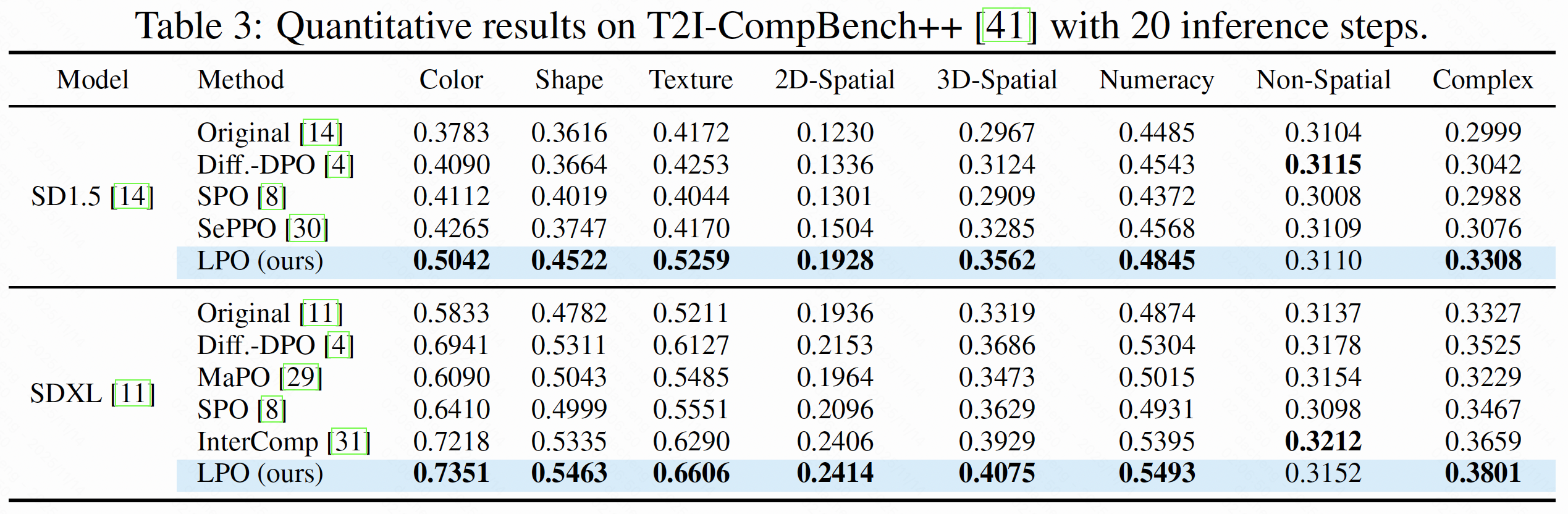 在更具挑战性的 T2I-CompBench++ 基准上,LPO 在颜色、形状、纹理、空间关系等维度均取得领先成绩,尤其在颜色与纹理生成方面,提升超过 10%。