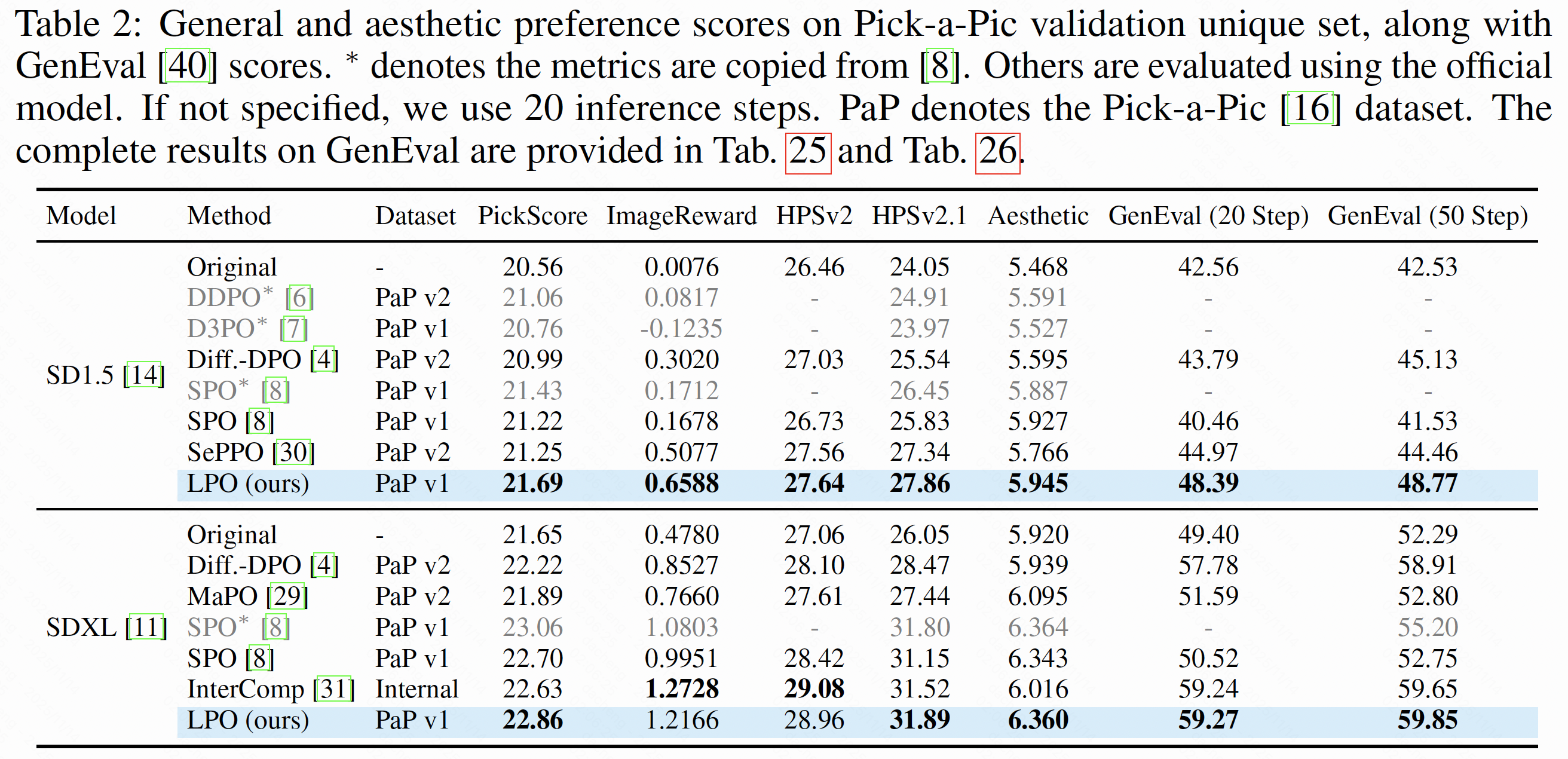 LPO 方法在整体人类偏好得分、图文对齐能力、图像美学质量等多个维度均大幅提升模型性能,在 PickScore、ImageReward、HPSv2 和 Aesthetic Score 等指标上均显著优于现有方法。