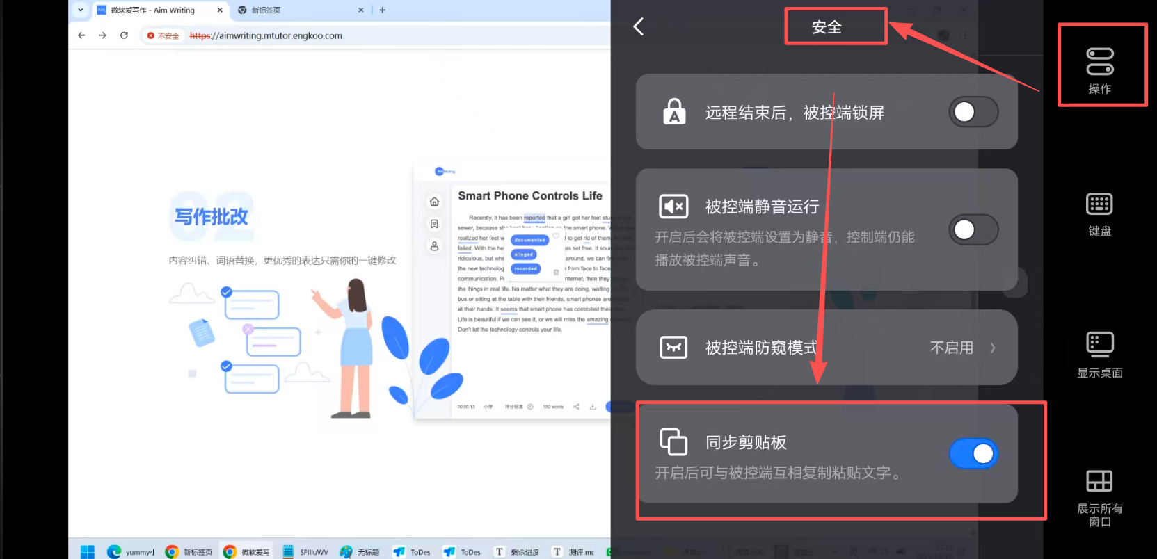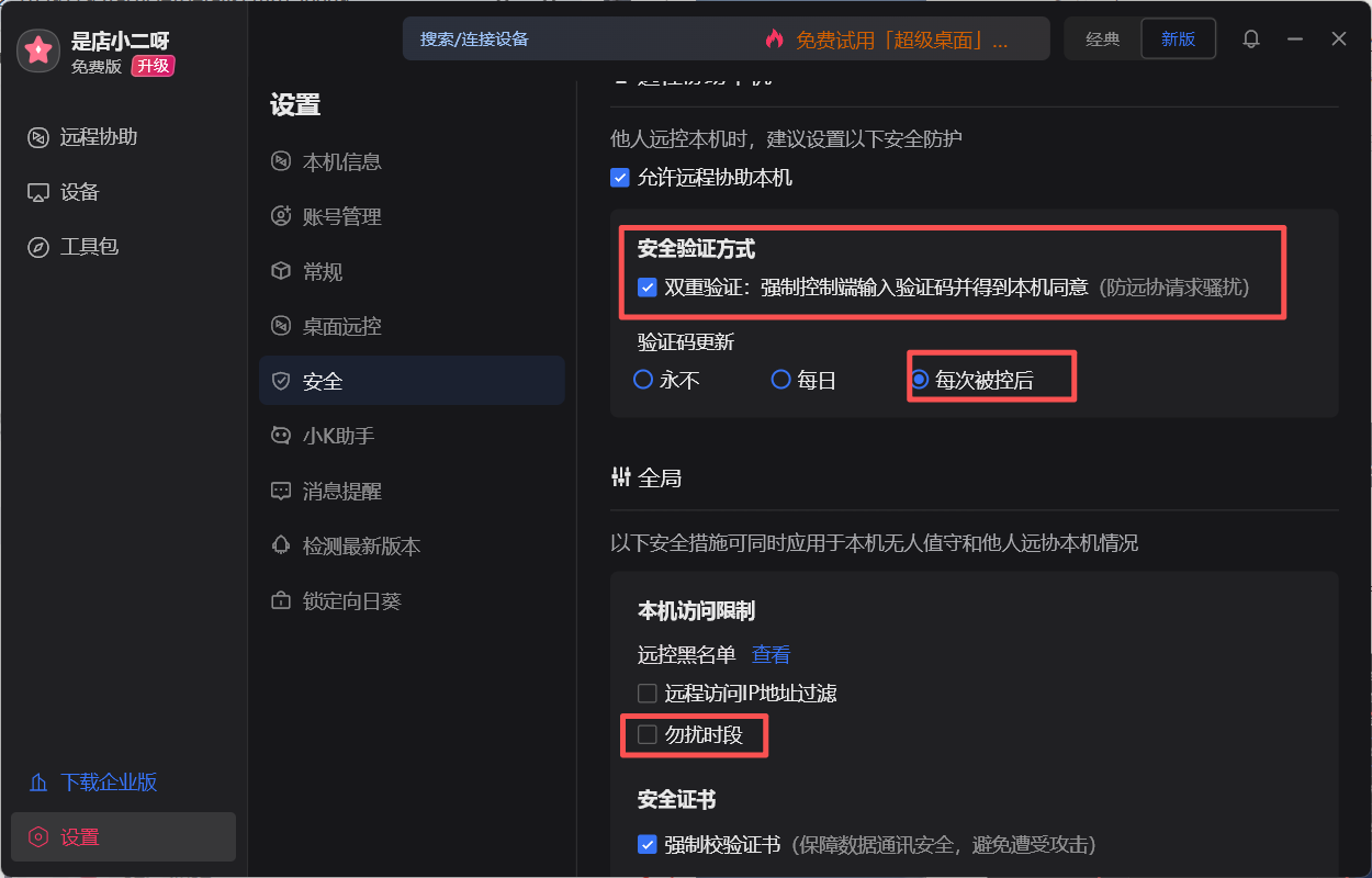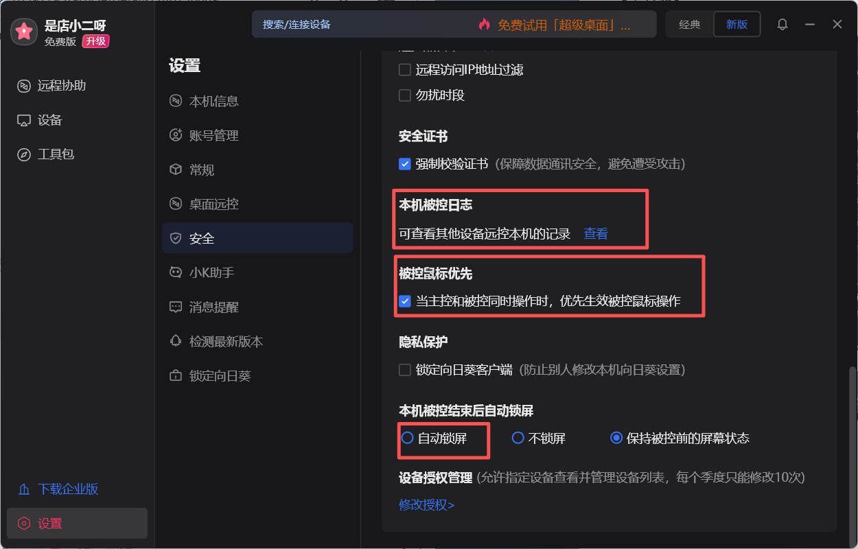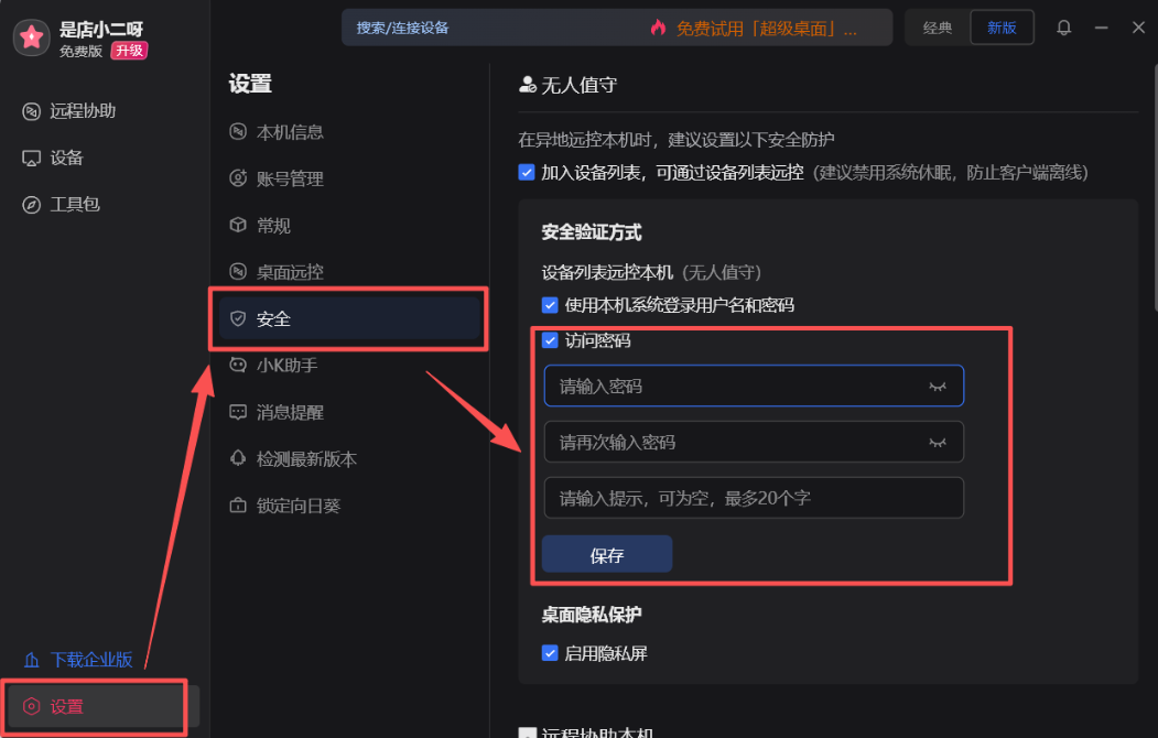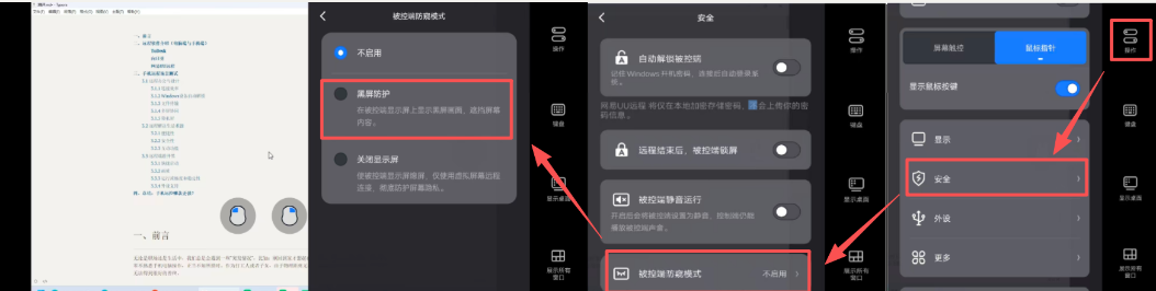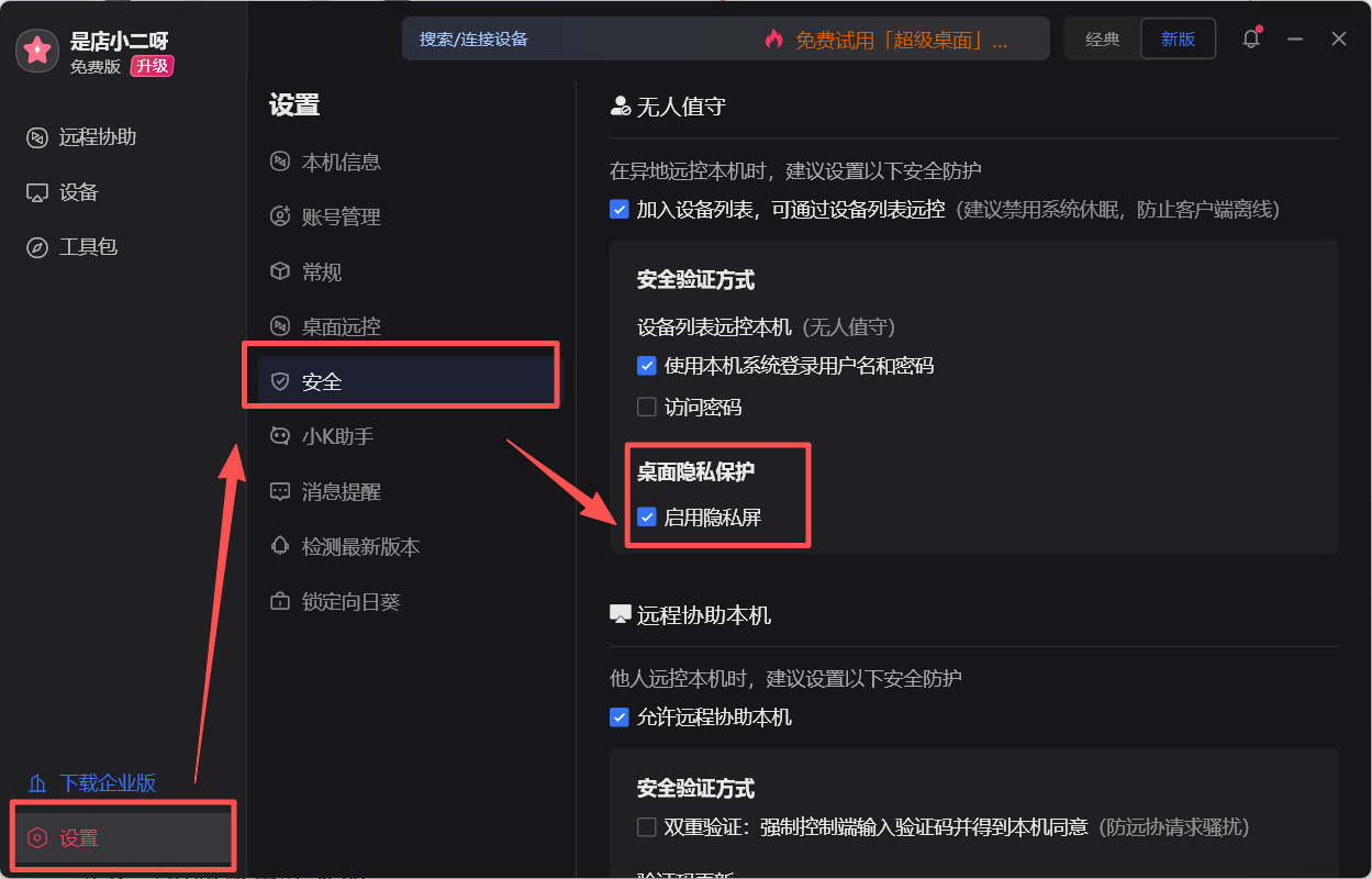 点击"设置"->"安全"->"启动隐私屏",可以保证在远程控制电脑设备时,过程不能被外界看到。