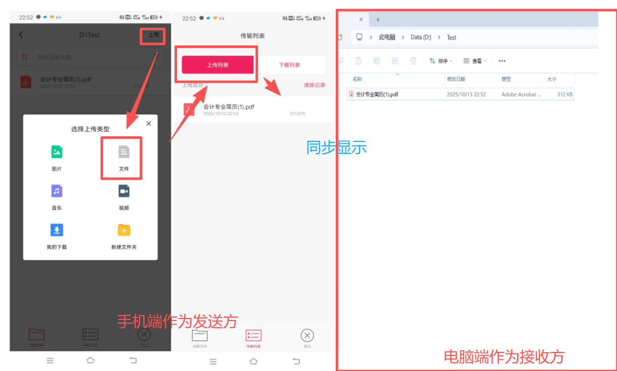 向日葵手机连接到电脑设备就会跳转到"最左侧图",支持"路由上传路径"。通过左上角"上传"选择不同的文件类型进行文件传输。但是美中不足的是,在手机远程控制过程中,是没有"文件传输"功能,这意味着需要"退出链接"再点击"文件传输"才能使用这个功能。