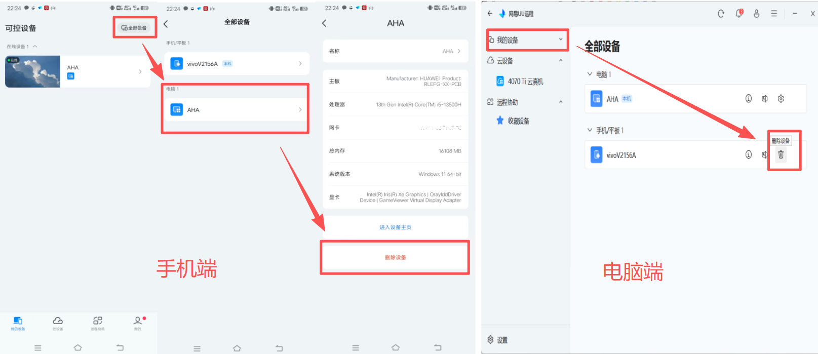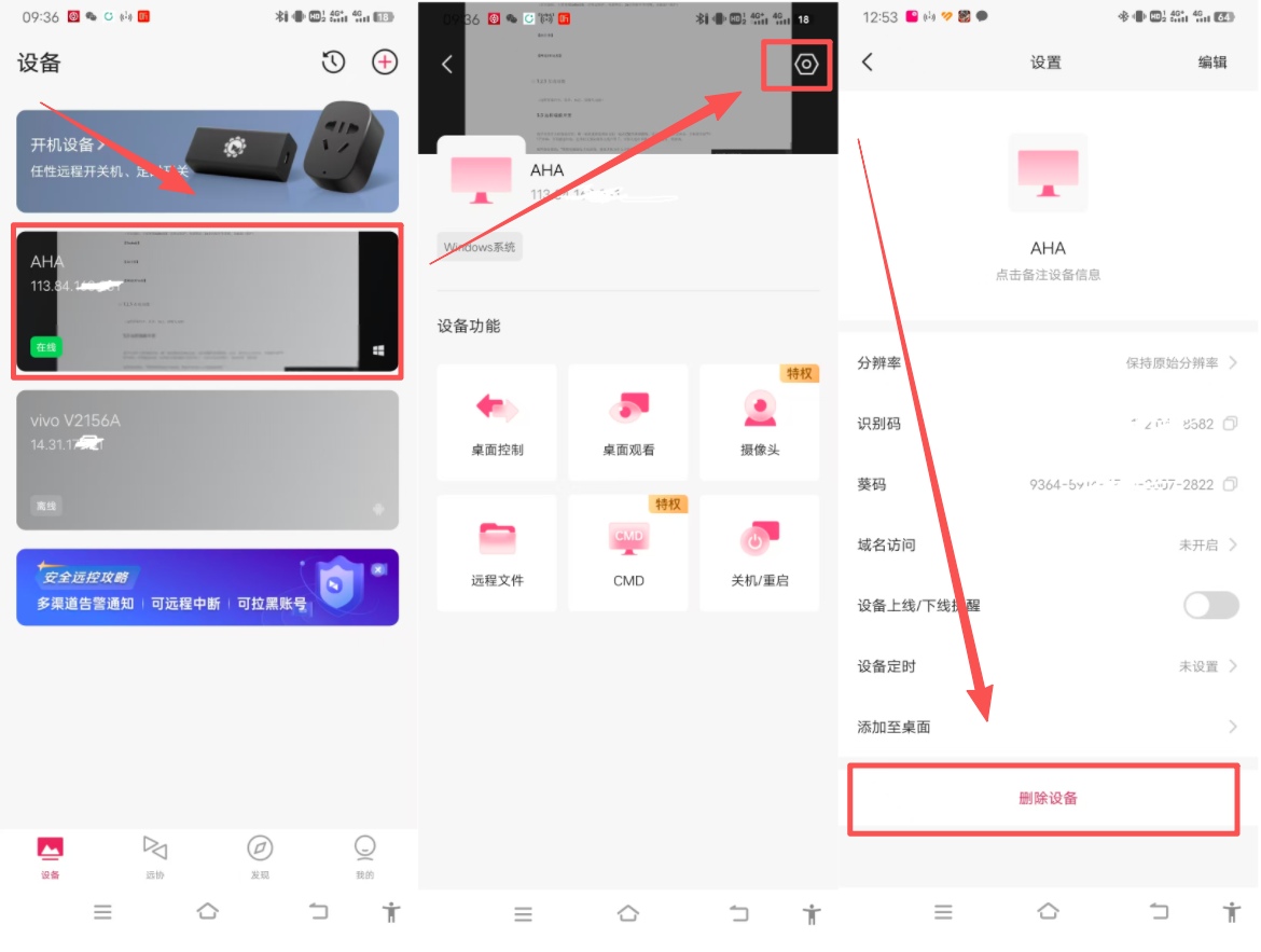 向日葵手机端设备解除绑定如下,一般都是点击"指定删除设备"。手机端这做得比较详细,包括了"设备功能"和设备属性。
