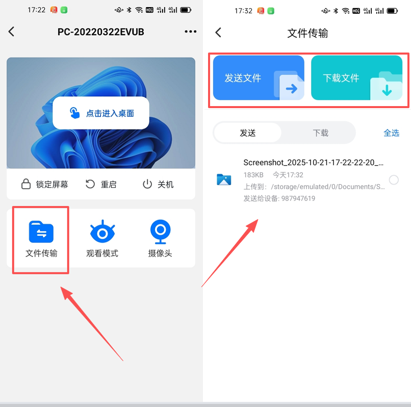 ToDesk 同时具备传统的远程文件传输,手机主控点击【文件传输】后输入被控的连接密码或免密连接,选择发送的文件和被控端接收的文件夹,秒速即传,完成文件传输。