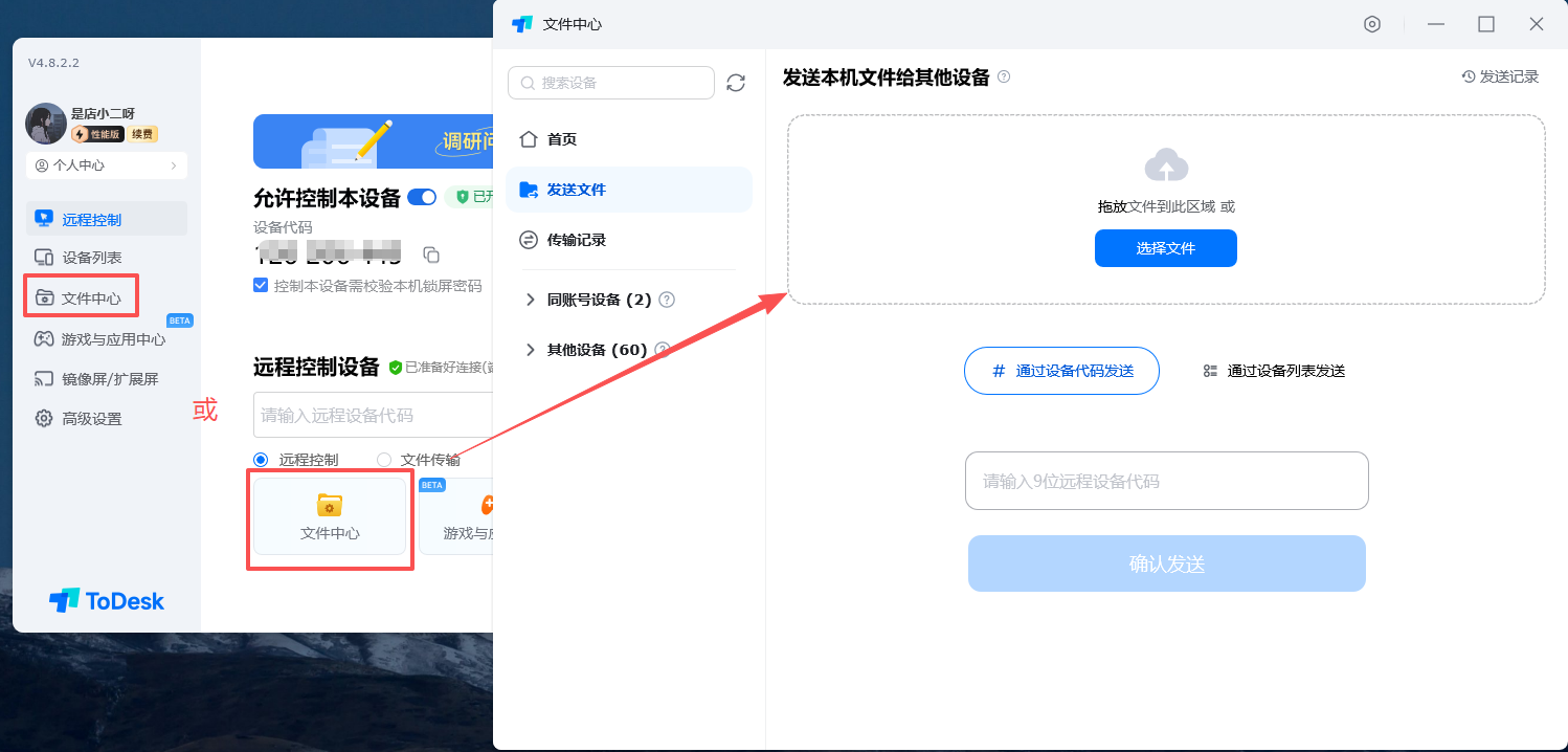 ToDesk 在文件传输功能上独树一帜,采用了全新的【文件中心】功能作为文件传输中枢。