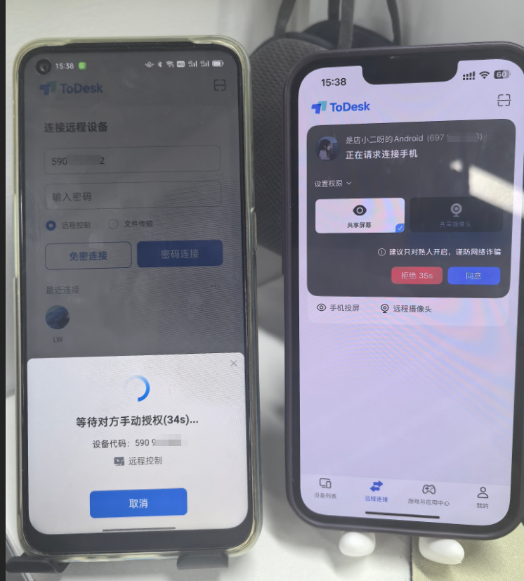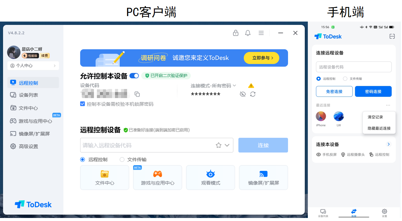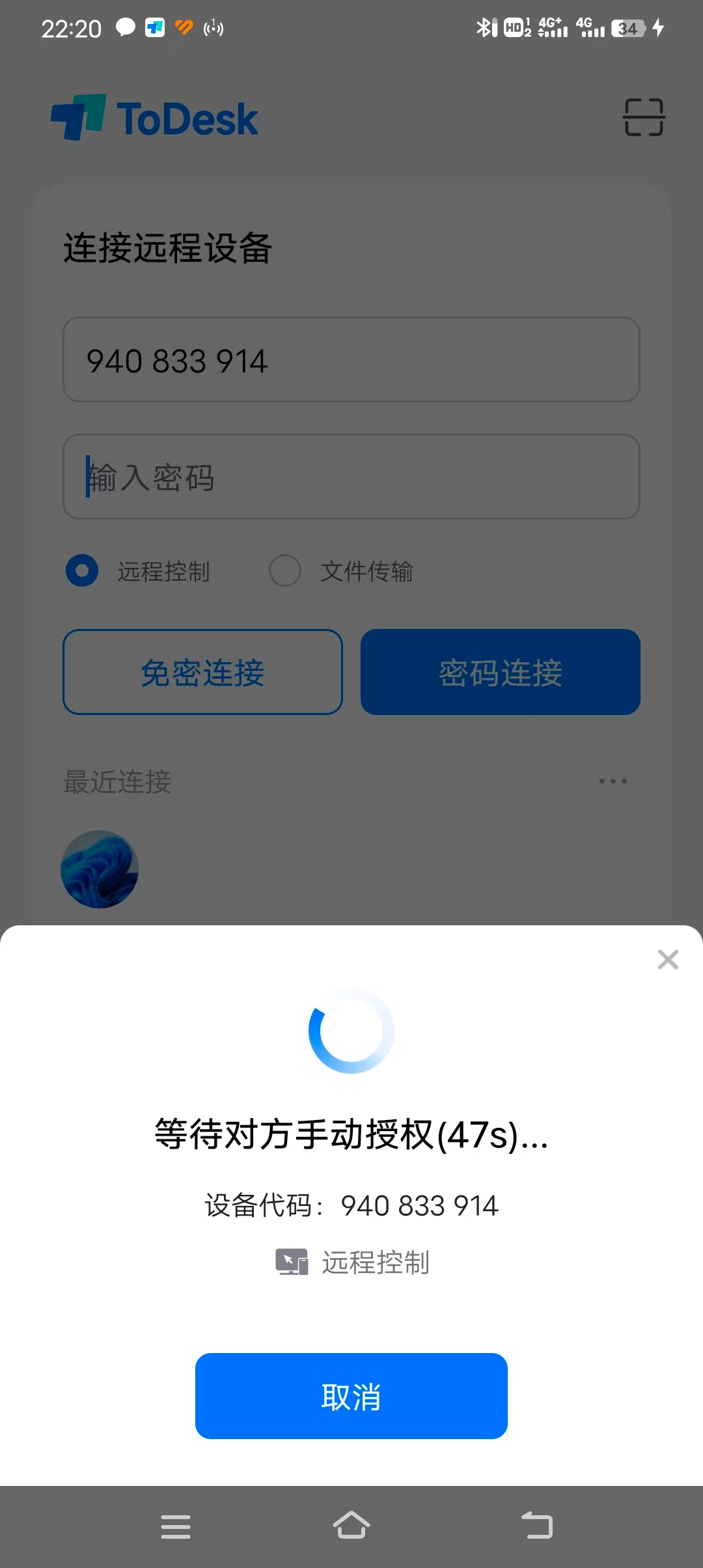 免密连接:无需输入远控设备的密码,点击后等待被控设备同意,很方便但需要被控授权;