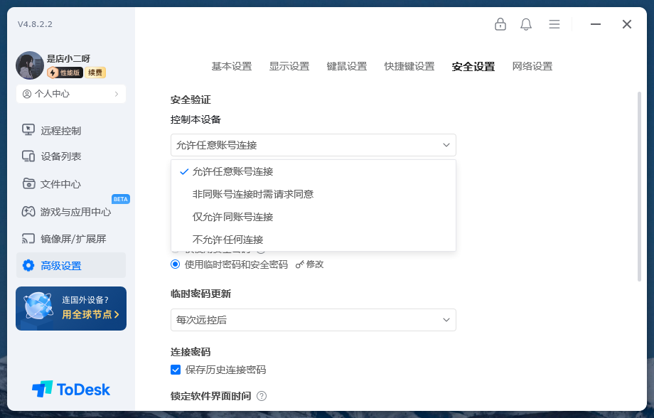 对于 ToDesk 安全措施方面,点击"高级设置-安全设置"。