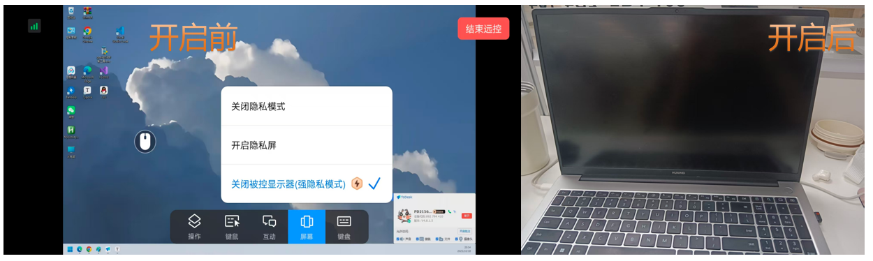 电脑这边会提示“远端对本机正在进行隐私屏远程操作”,被控可以看到远控提示,没有退出机制。