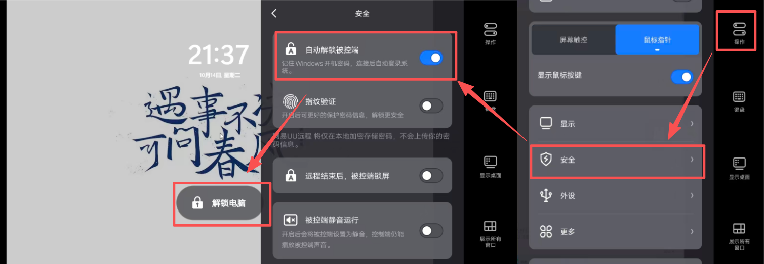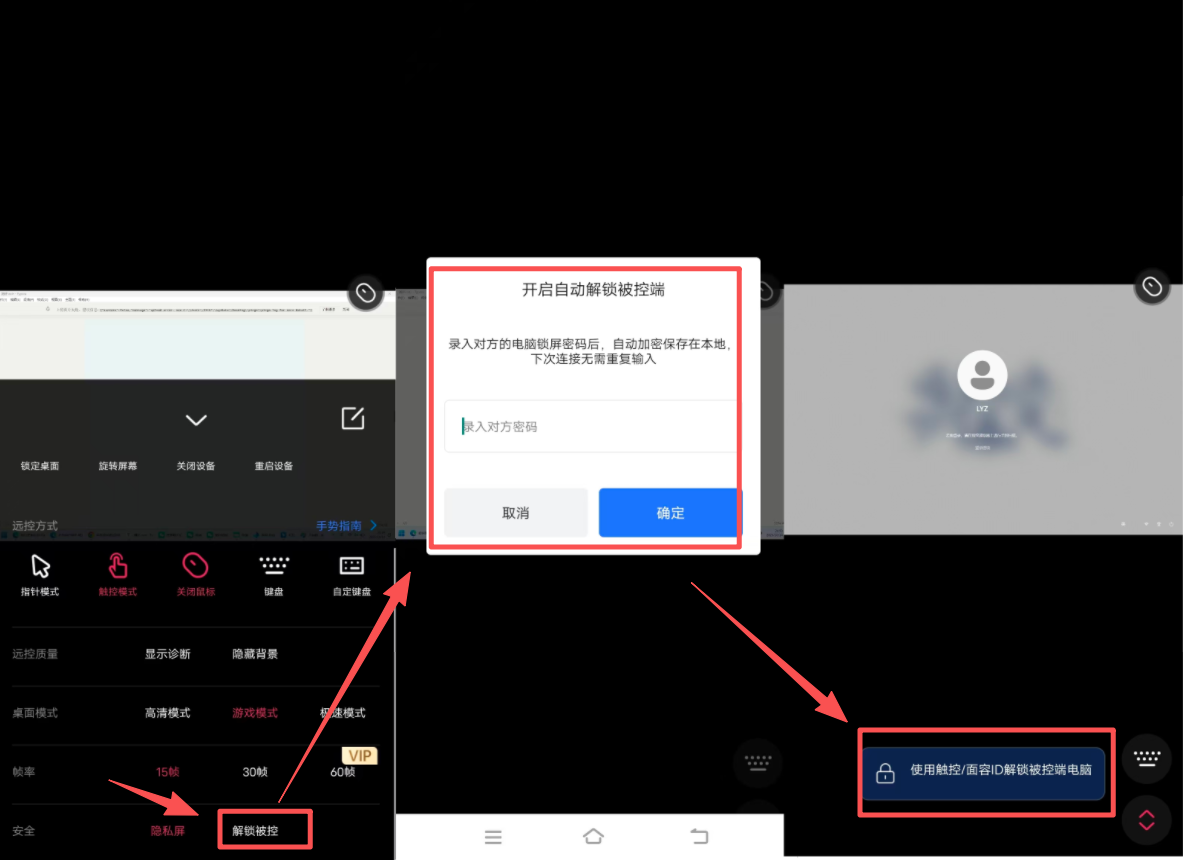 需要"开启自动解锁被控端",然后也是采取"模拟输入"方式进行解锁。