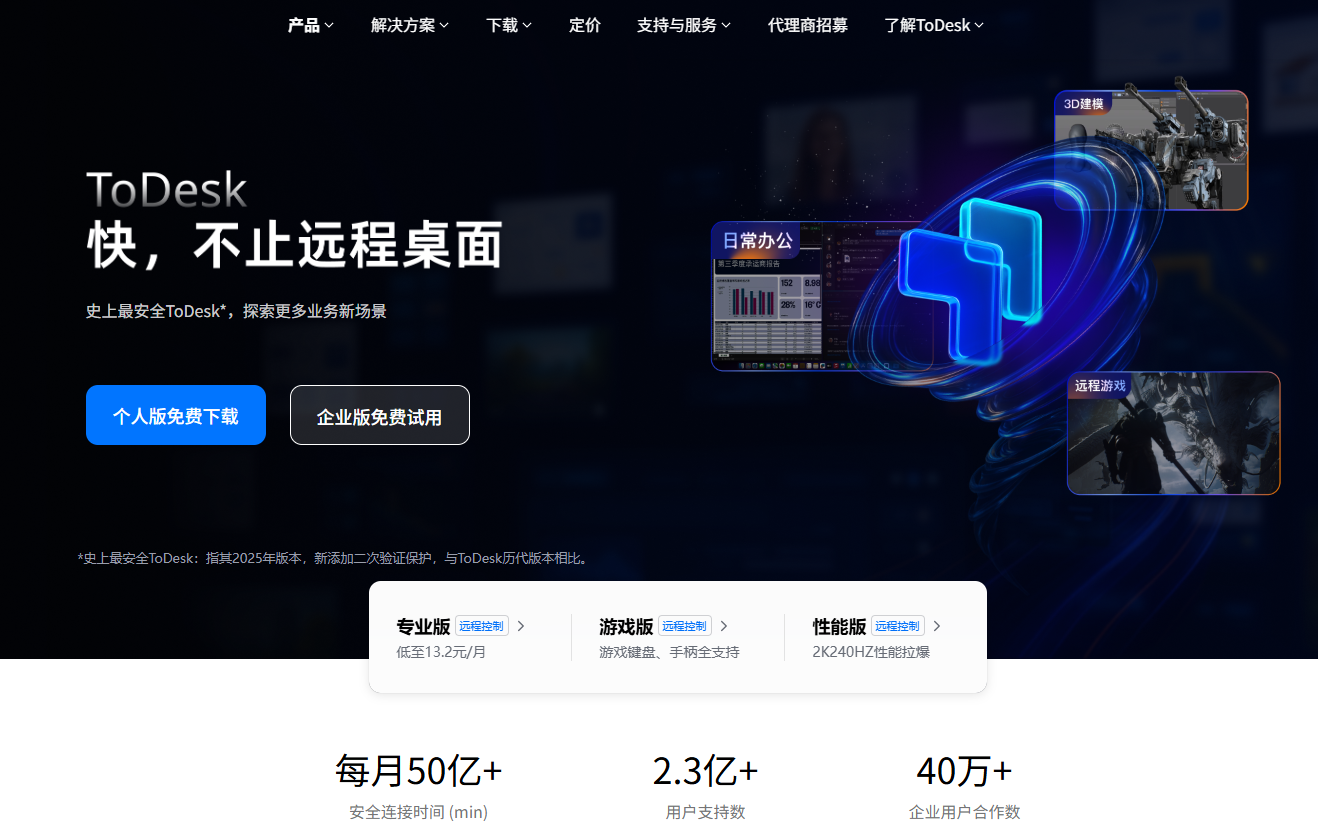 ToDesk (全能六边形战士):综合表现最强。它在办公、生活、安全、游戏等几乎所有维度都表现出色且没有明显短板。功能全面强大(如文件中心、多种隐私/多屏模式),安全措施考虑得最为周到(防诈、金融保护),游戏体验也足以满足绝大多数玩家。对于追求功能全面、高性价比、安全可靠的广大用户而言,ToDesk 实至名归,是当之无愧的首选。