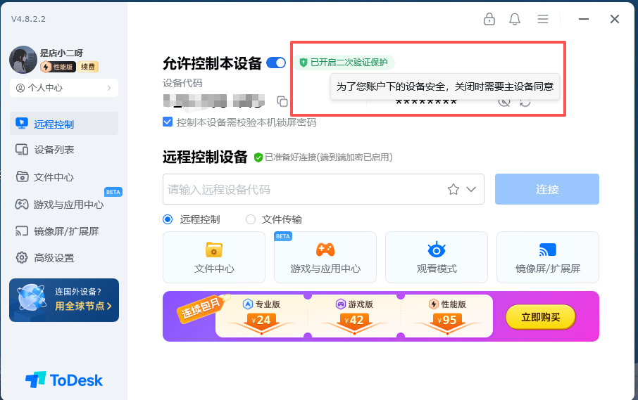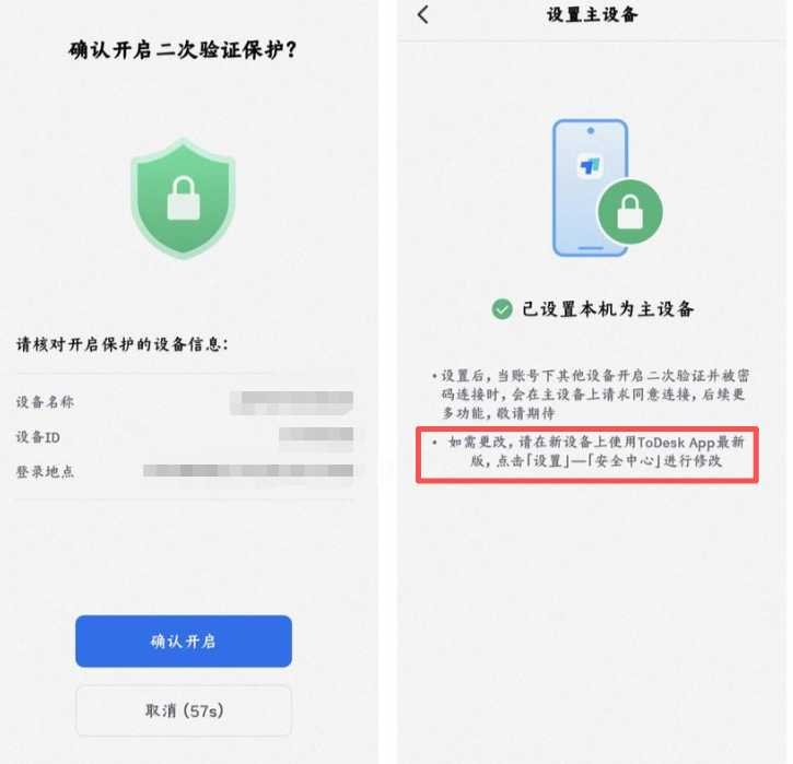 电脑端开启"二次验证保护"十分简单,登入电脑端 ToDesk 软件,会有明显的提示语。