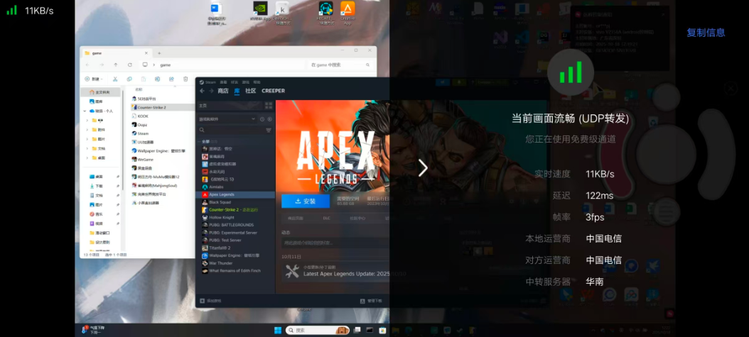 UU 远程和 ToDesk 在远程游戏方面,无论游戏界面还是运行游戏过程,都是很舒畅和稳定。通过图中网络状态可以看出没有很明显的波动,帧延时稍微有点高,但不影响。
