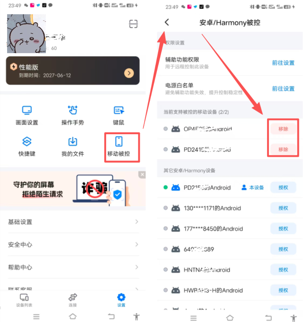 我这里是固定 2 台被控设备,意思就是说:目前有两台手机可以被控制。当我想要替换或者删除被控设备时,可以在【设置】-【移动被控】-【当前支持被控的移动设备】进行移除和授权。