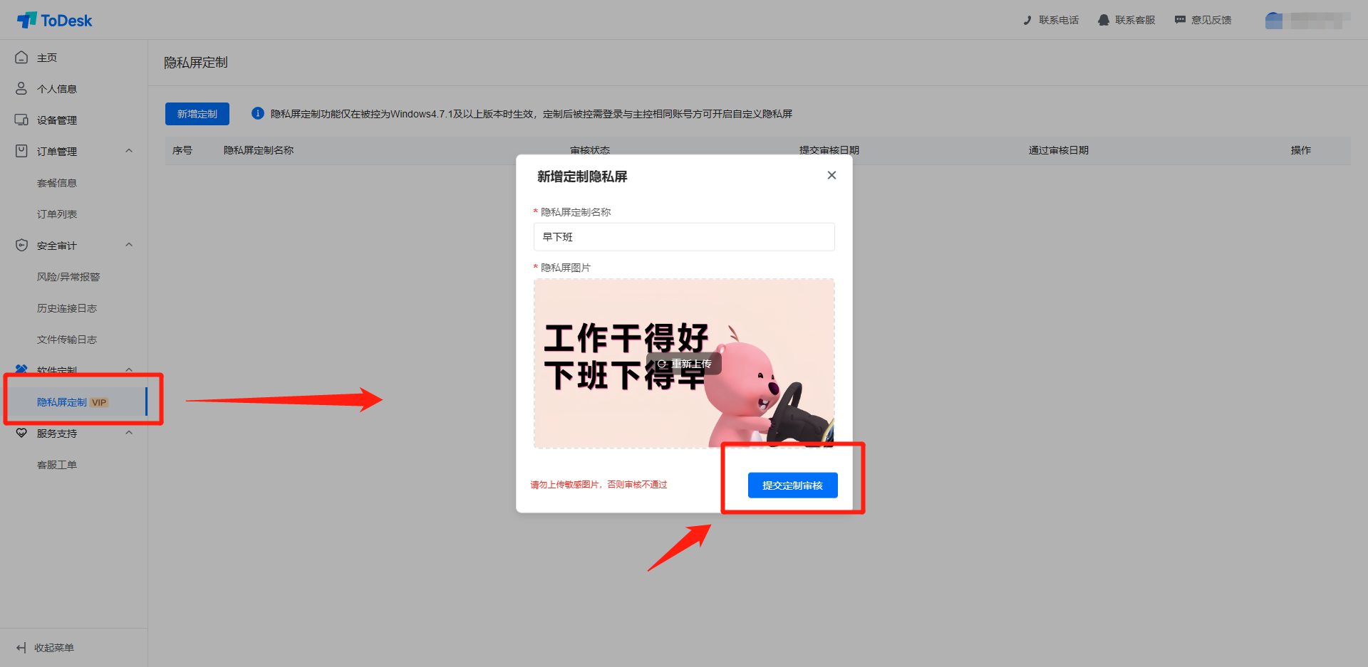 ToDesk 会员能享受隐私屏定制,电脑端登录个人中心进行设置,开启隐私屏后完全就和桌面壁纸一样。