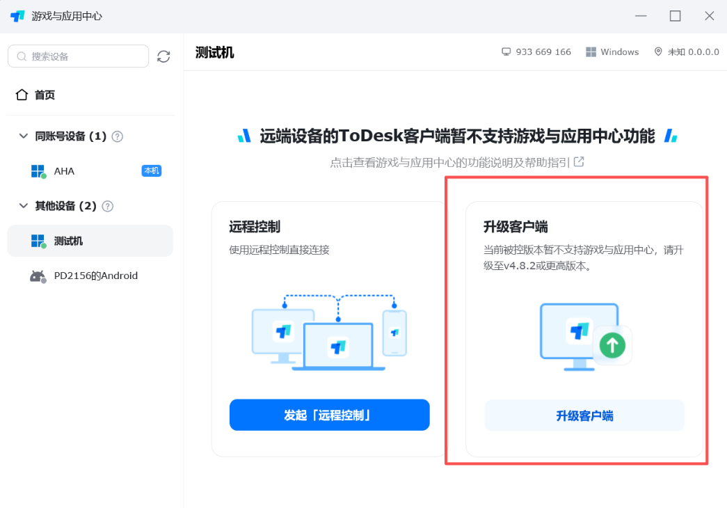 目前 ToDesk 的"游戏与应用中心"支持"v4.8.2 或更高版本"。如果版本过低,可以进入官方链接下载。
