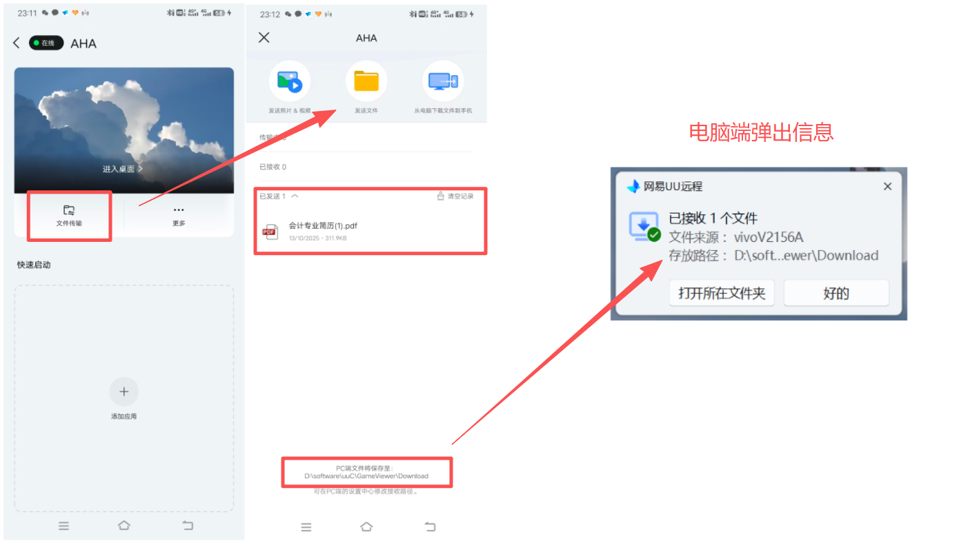 UU 远程仅支持手机文件传输给电脑,在路径选择在灵活度方面上,不如 ToDesk 和向日葵,需要事先准备好一个路径,专门存放远程设备传输过来的文件。