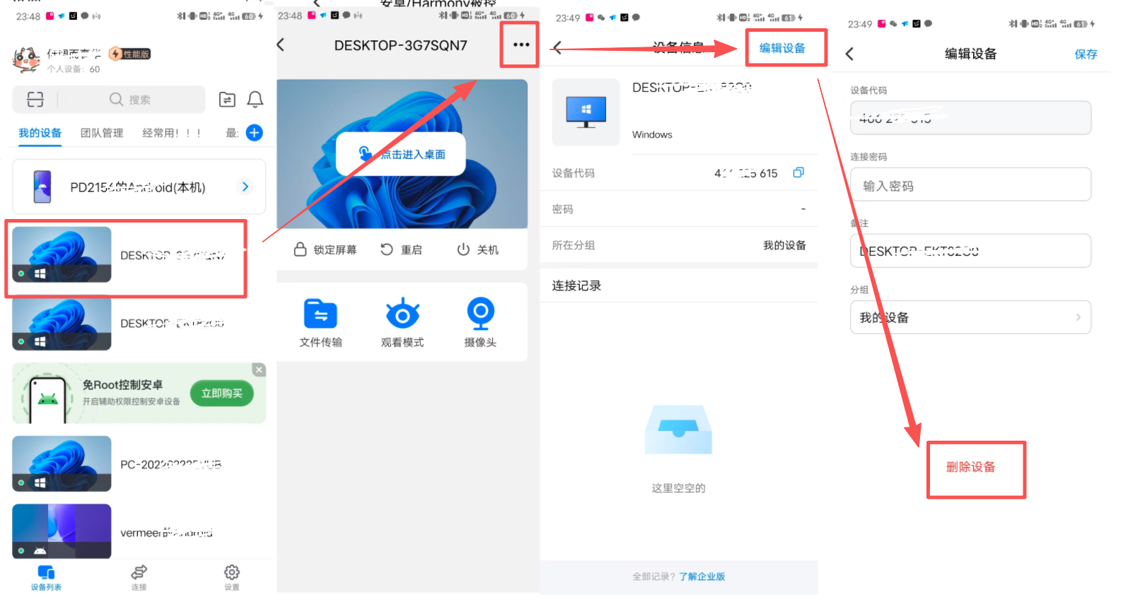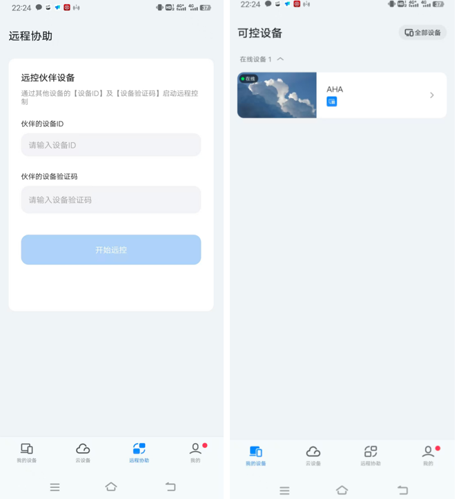 【设备列表】则展示我所有的远程设备记录,可以进行管控或点击进入在线设备。