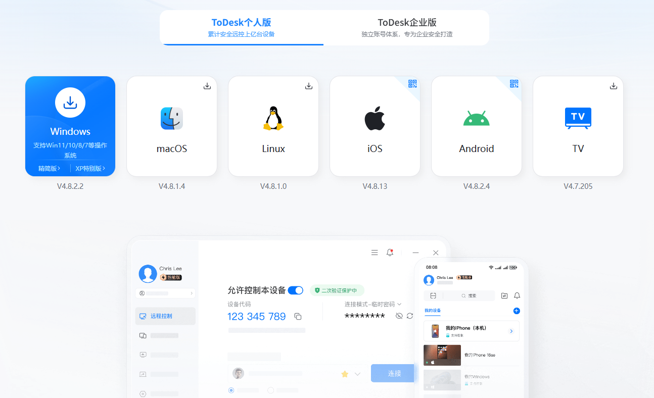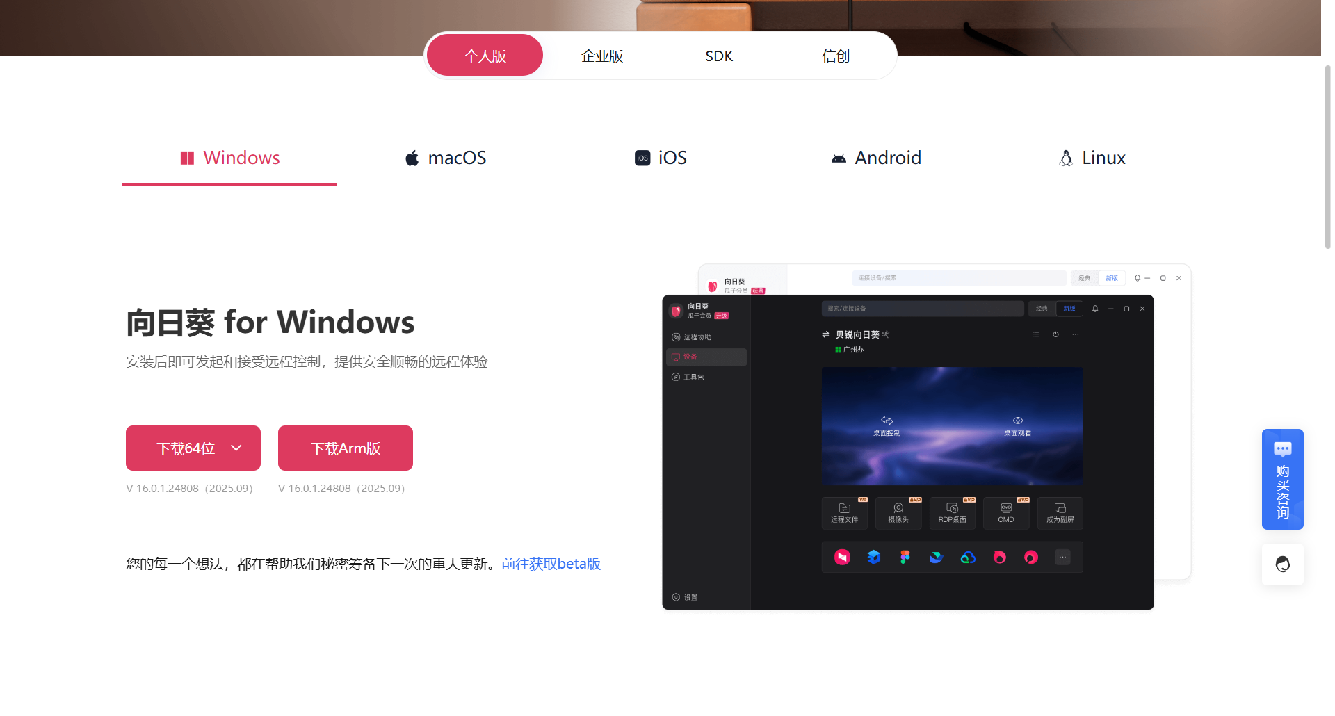 向日葵兼容Windows、macOS、Linux、IOS、Android系统,比 ToDesk 少了 TV 版本。版本多样,这里通常选择个人版即可。