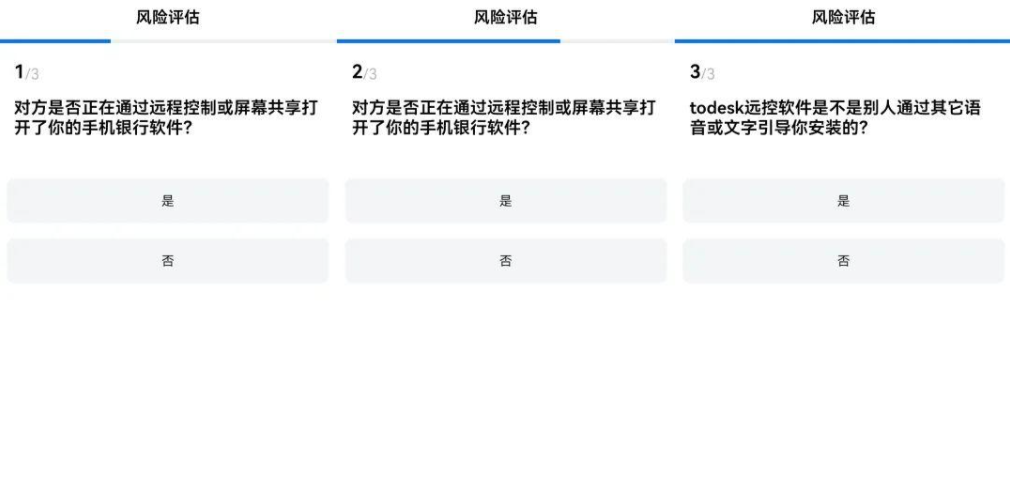 基本流程就是,当主控发起远程操控,被控会弹出"风险评估"窗口。如果风险评估不合格,会中断连接。同时,使用 ToDesk 打开金融 APP 如:某某银行、支付宝、云闪付等,直接黑屏掉,主控方看不见被控界面也就操作不了银行转账,彻底切断了诈骗行径。
