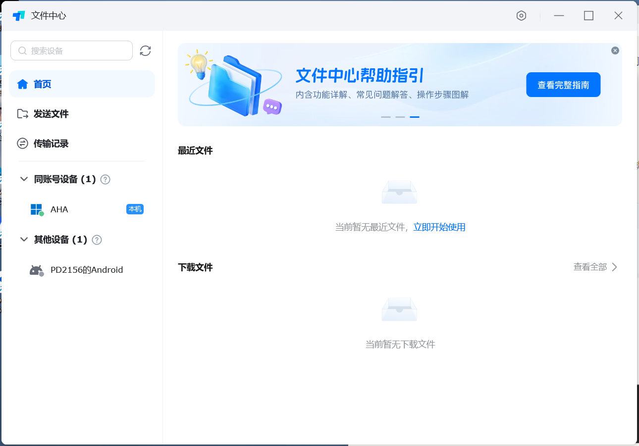 点击【文件中心】来到文件中心控制台,提供了记录“最近文件”和“下载文件”,还有本机的文件传输记录、查看文件和管理文件一应具备,而且这块可以"拖放文件或选择文件",比较灵活。