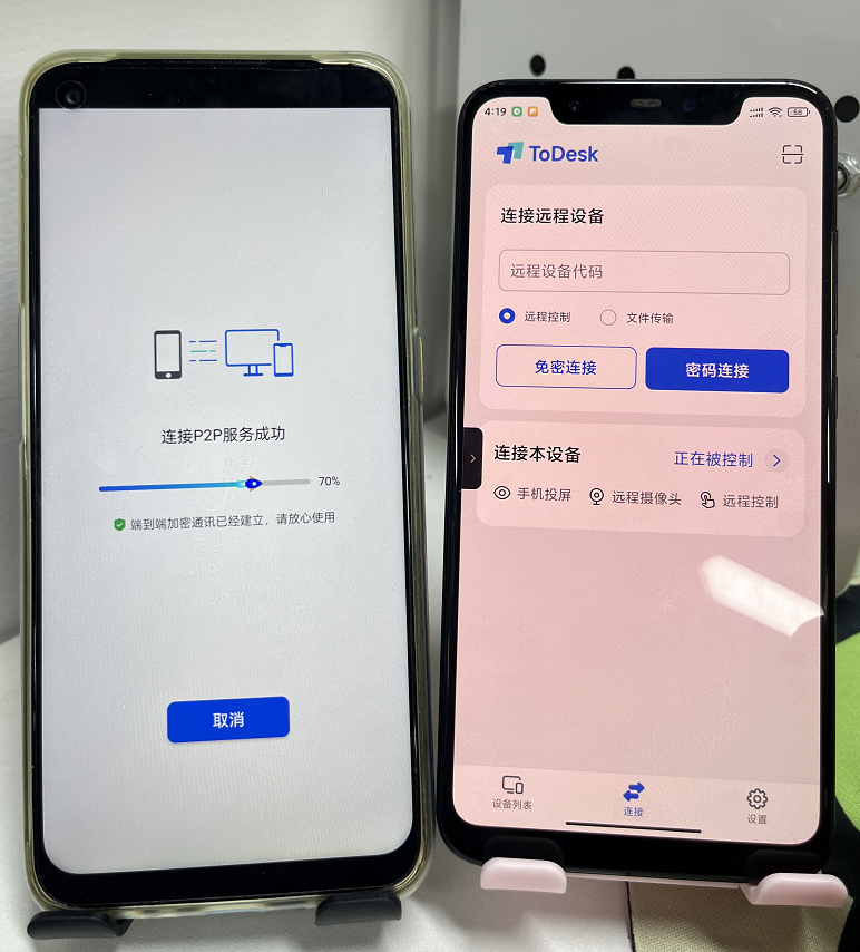 ToDesk 支持安卓手机互控和苹果手机投屏,互控是可以进行远程操作,支持消息发送、语音通话和批注,主被控都可以立即结束远控。还可以点击文件传输、观看模式和摄像头进行常规远程操作;投屏就是屏幕 1:1 共享。