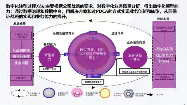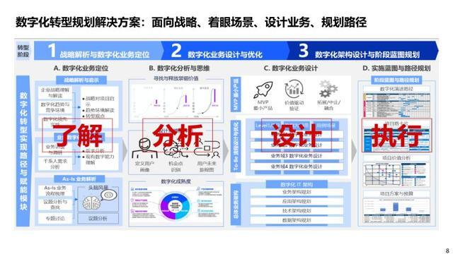 以价值效益为导向,遵循 “战略解析 — 业务设计 — 架构规划 — 路径实施” 四阶段推进。聚焦数字化运营、创新、服务与生态四大目标,构建业务、应用、数据、技术、管理五大架构。通过 MVP 小产品验证价值,再逐步拓展融合,利用 PDCA 循环持续打造新型能力,实现业务与数字深度融合。