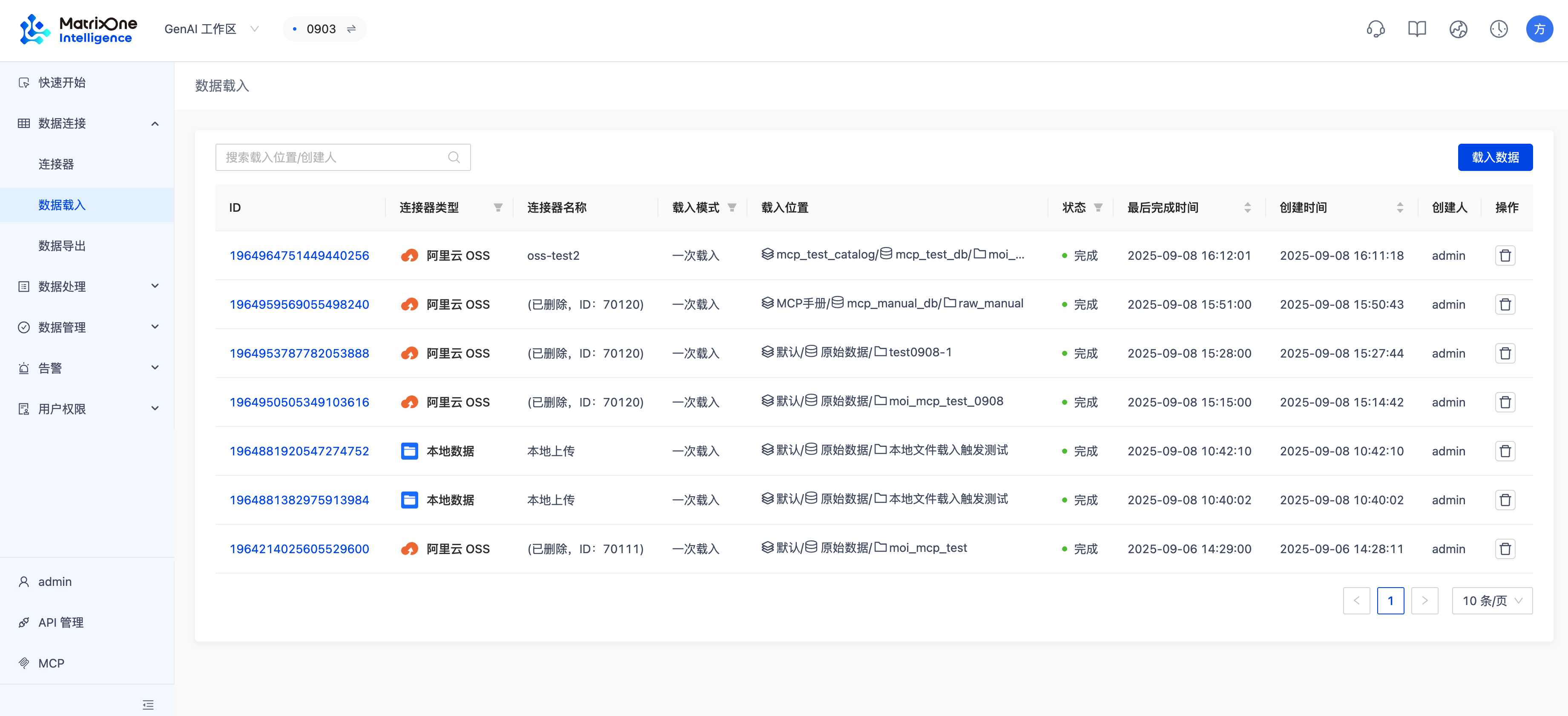 连接器建好后,创建一个加载任务,将 OSS 中的 moi_mcp 手册.md 文件加载到刚创建的 moi_mcp_test 卷中。