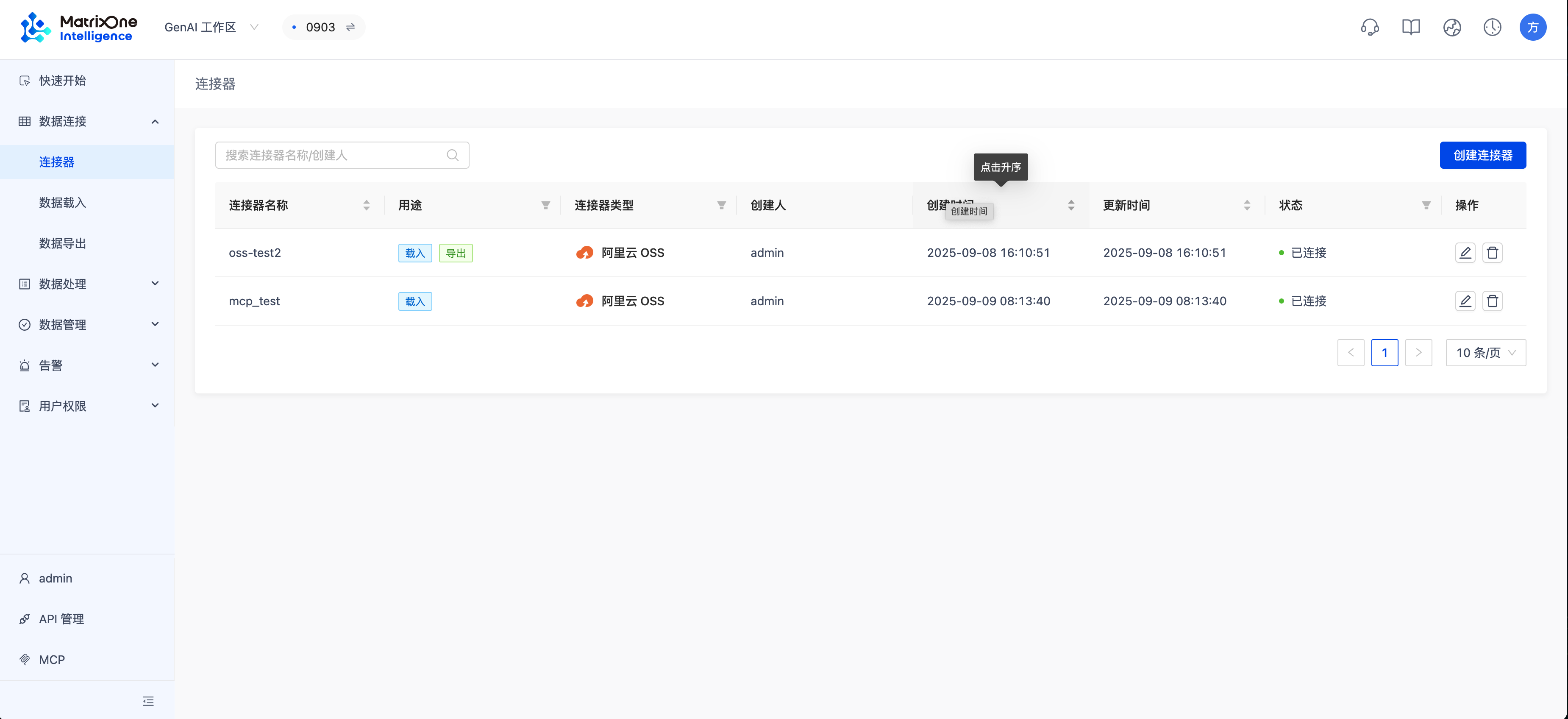 现在,数据已在云端。我们需要让 MOI 平台能够访问它。首先创建一个指向该 OSS 存储桶的连接器,并创建一个用于存放原始数据的卷。