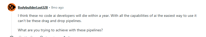 “ 这些做 AI 的无代码平台活不过一年。AI 如果真的这么强大,就不应该还靠拖流程框来实现功能。”