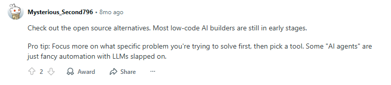 “ 建议去看看开源的替代方案,大部分低代码 AI 工具还都很早期。