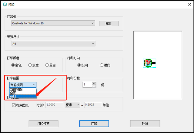 如果打印预览中的图纸过小,可以查看是不是在设置【打印范围】时,选择了当前视图,如果是可以将其修改为【窗口】。