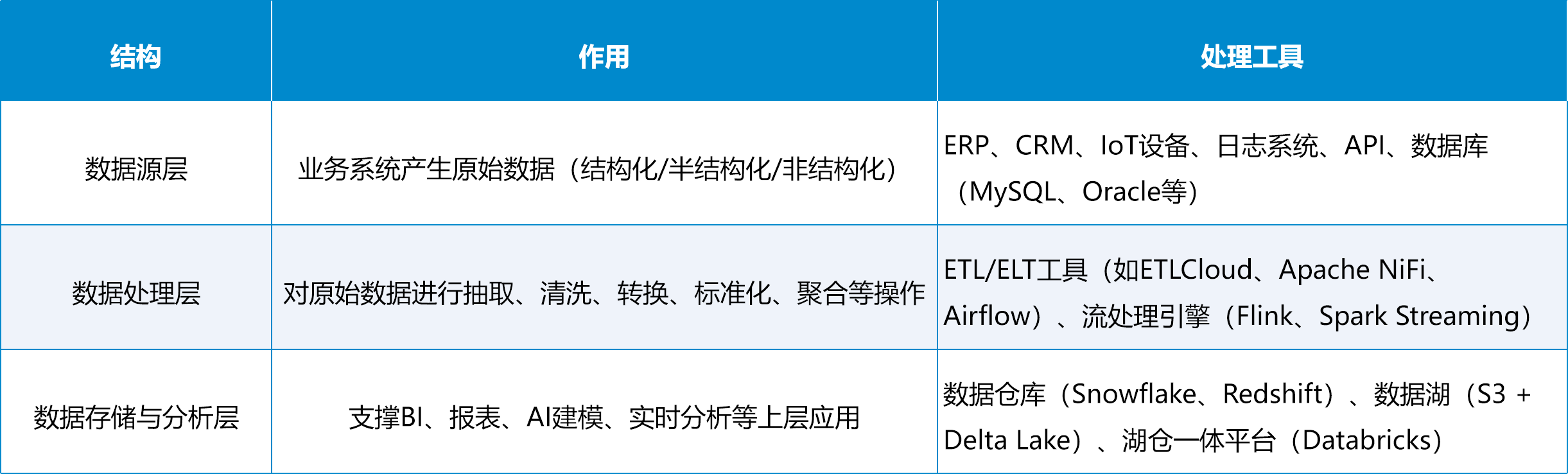 现代企业数据体系通常遵循“来源 → 处理 → 存储/分析”的三层架构: